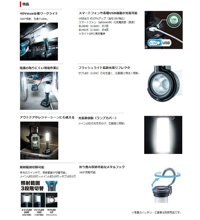 マキタ製の40Vmax対応充電式ワ-クライトのML002G(青)と