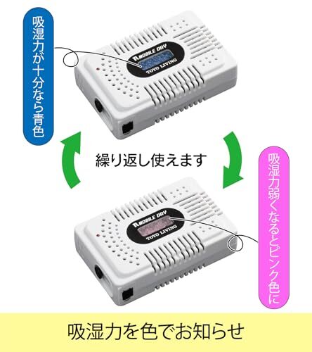 本体表面にある窓口の色がピンク色に変わったらプラグをコンセントに挿してください。2~3時間通電すると吸湿力が十分に回復し、青色に戻ります。ただし、初めて使うときは4時間通電してからお使いください。