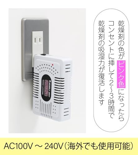 《モバイルドライ》はコンセントに挿すだけで繰り返しお使いいただける除湿ユニットです。除湿に使用している乾燥剤は日本製を採用し、繰り返しお使いいただいても安心です。海外の電圧(AC100~240V)にも対応していますので、海外旅行の際にもお使いいただけます。デジタルカメラグランプリ2021 収納アクセサリー部門で金賞を受賞しました。