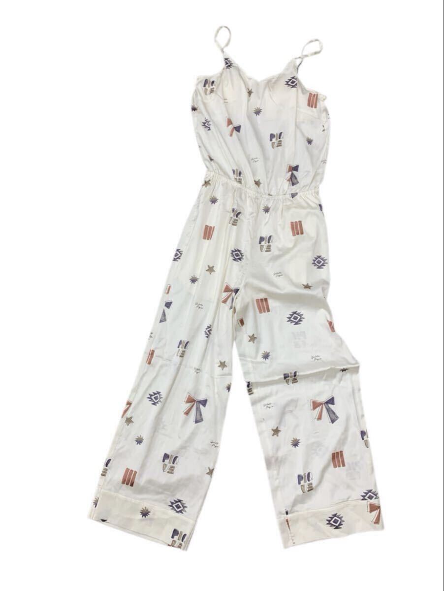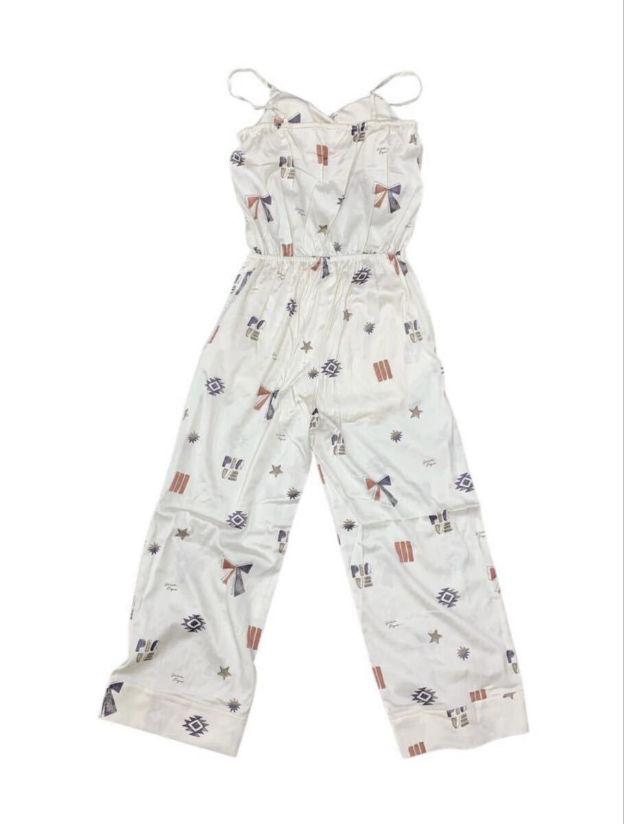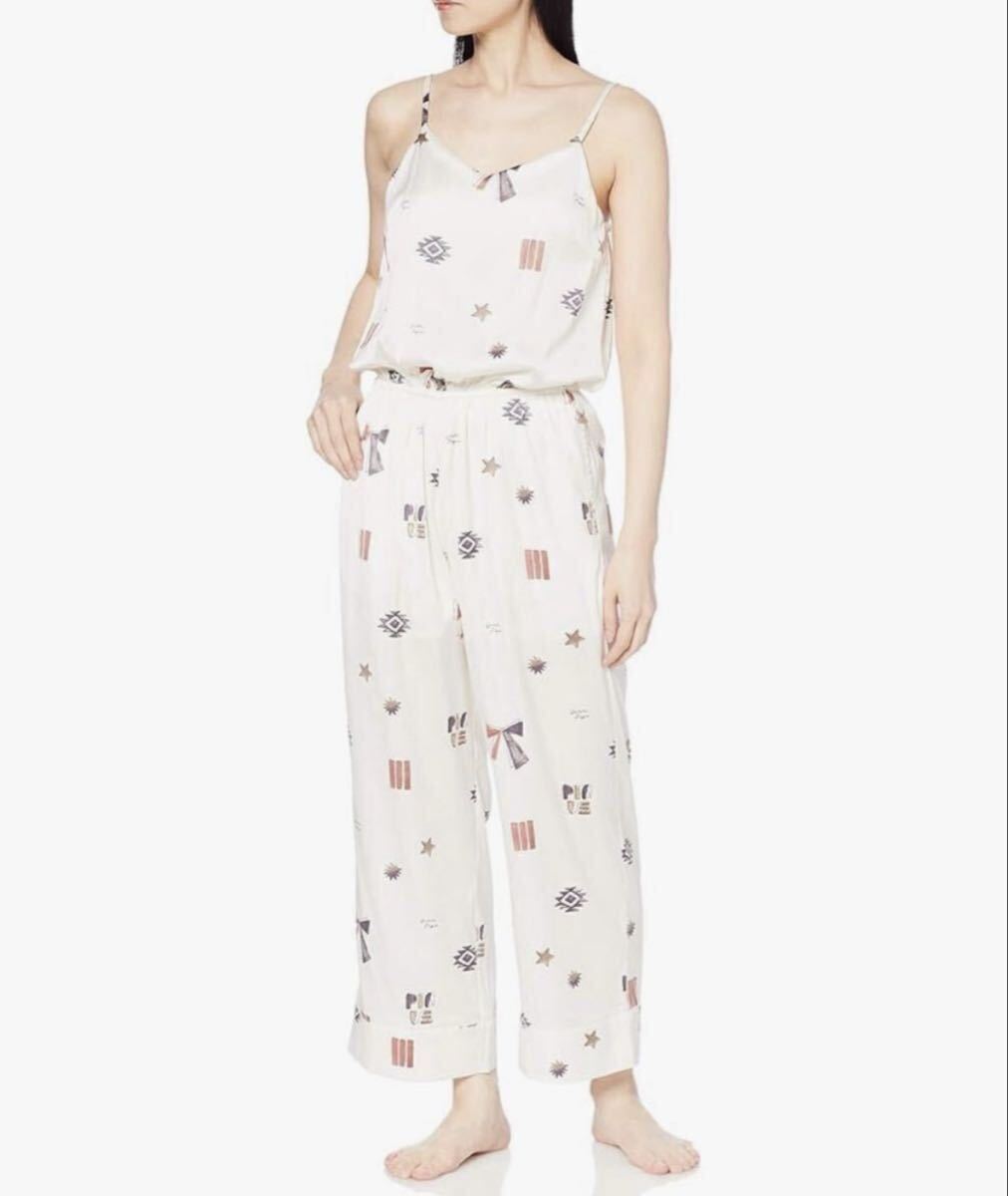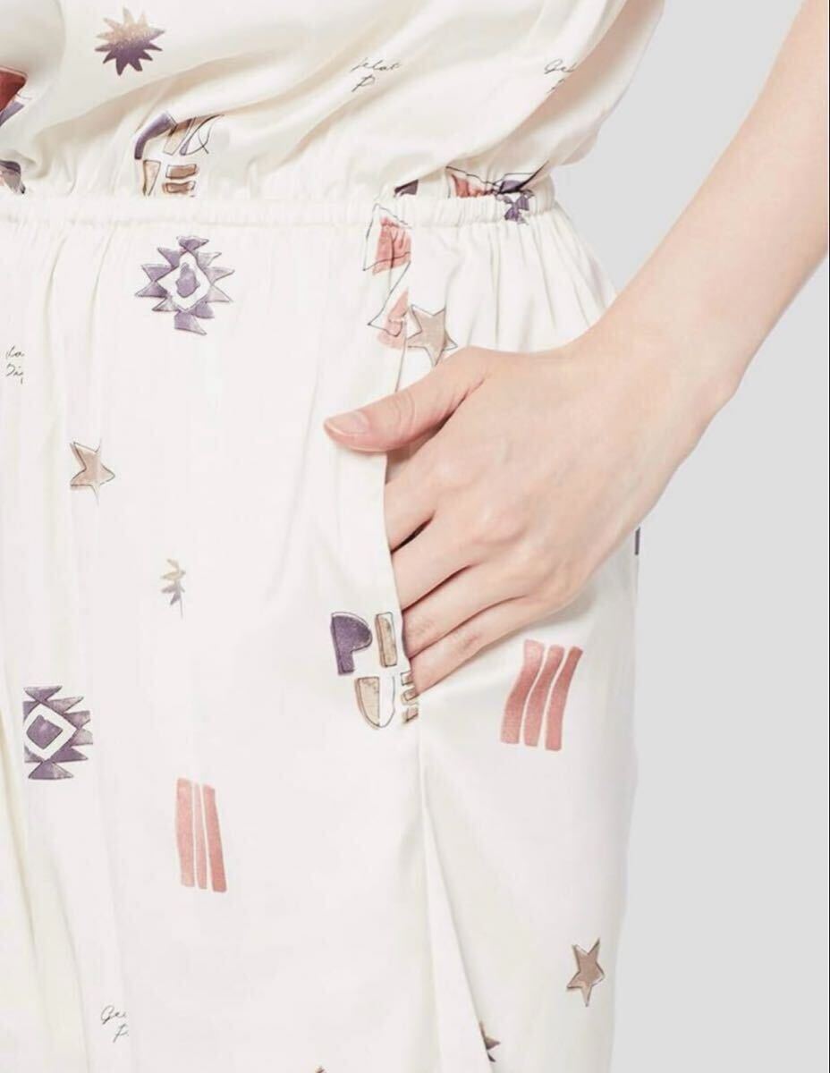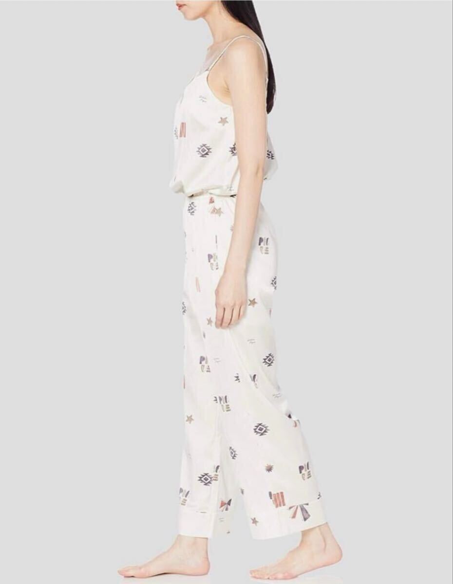 「gelato pique」のデザイナーが手書きで起こした、インテリアの一部になるようなおしゃれ柄のパジャマシリーズ。定番のリボンやスター、ロゴモチーフを、アートライクにペイントしました。プリントアイテムに抵抗のある方でも着やすいよう、スタイリッシュに仕上げたオールインワン。光沢のあるサテン生地とシックなデザインがマッチし、照れずに纏える一枚が完成しました。安心のカップイン仕様はおうちの中でも快適に、ブラウジングによるメリハリとすっきりとした落ち感で、スタイルアップも叶えます。