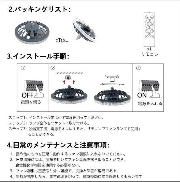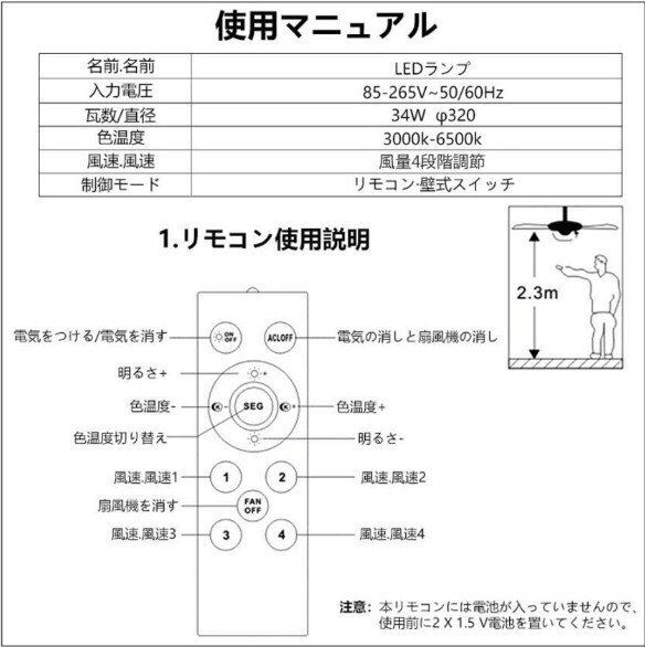 ・リモコン付き:調光調色、風量調節など全ての操作が可能なリモコン式、気分やシーンに合わせて明るさや色調を自在に調整できます。