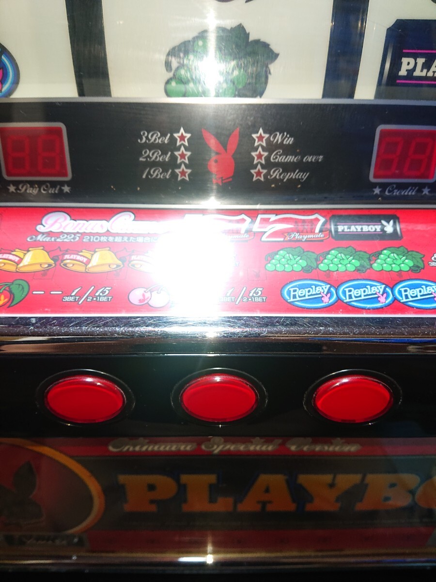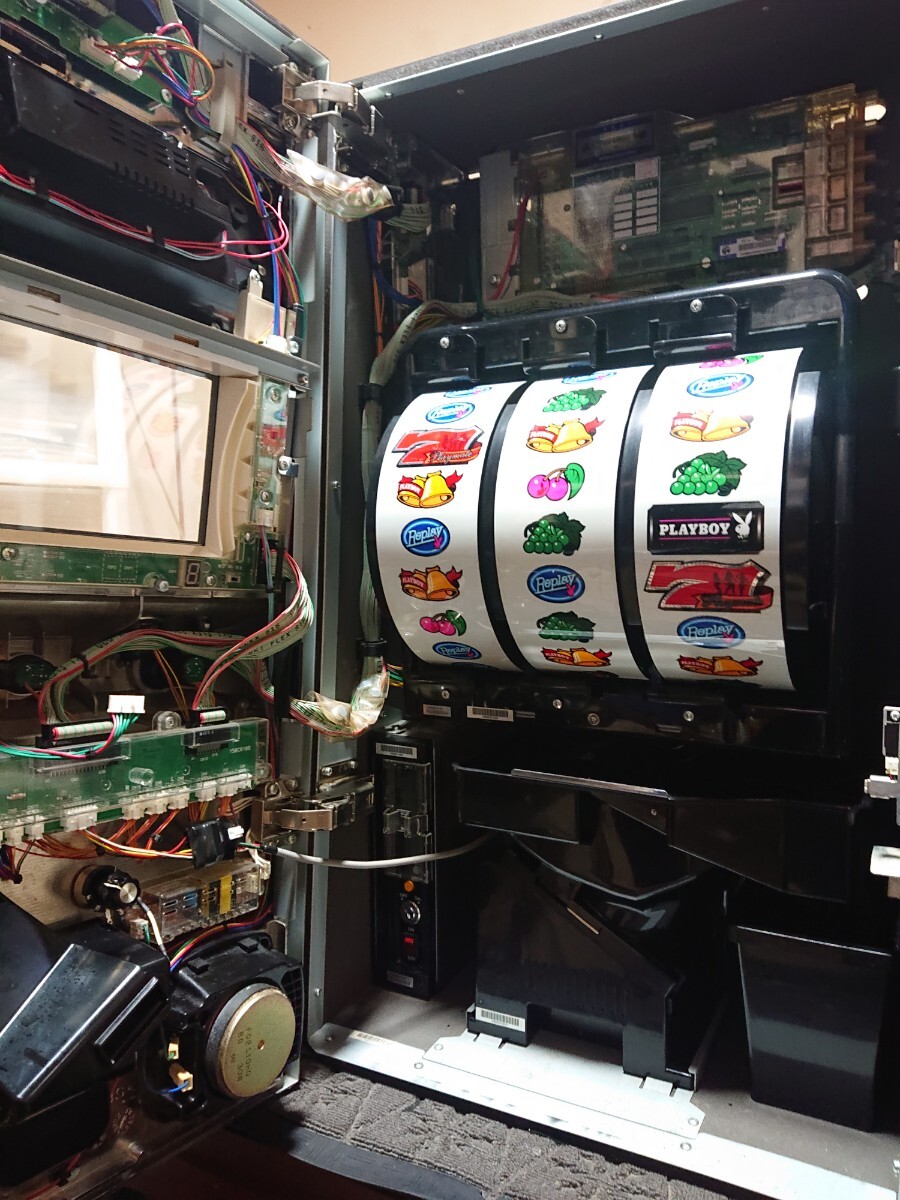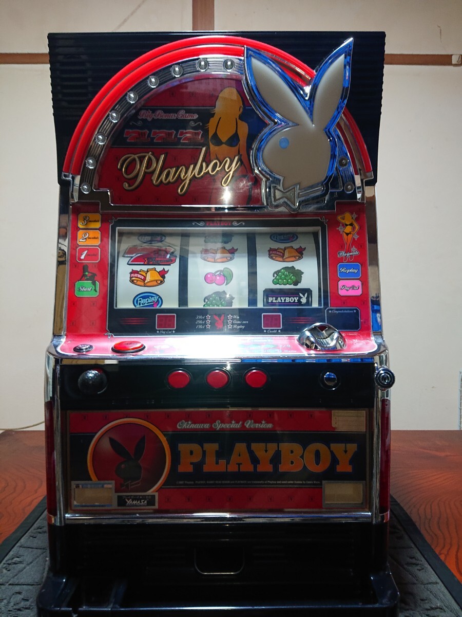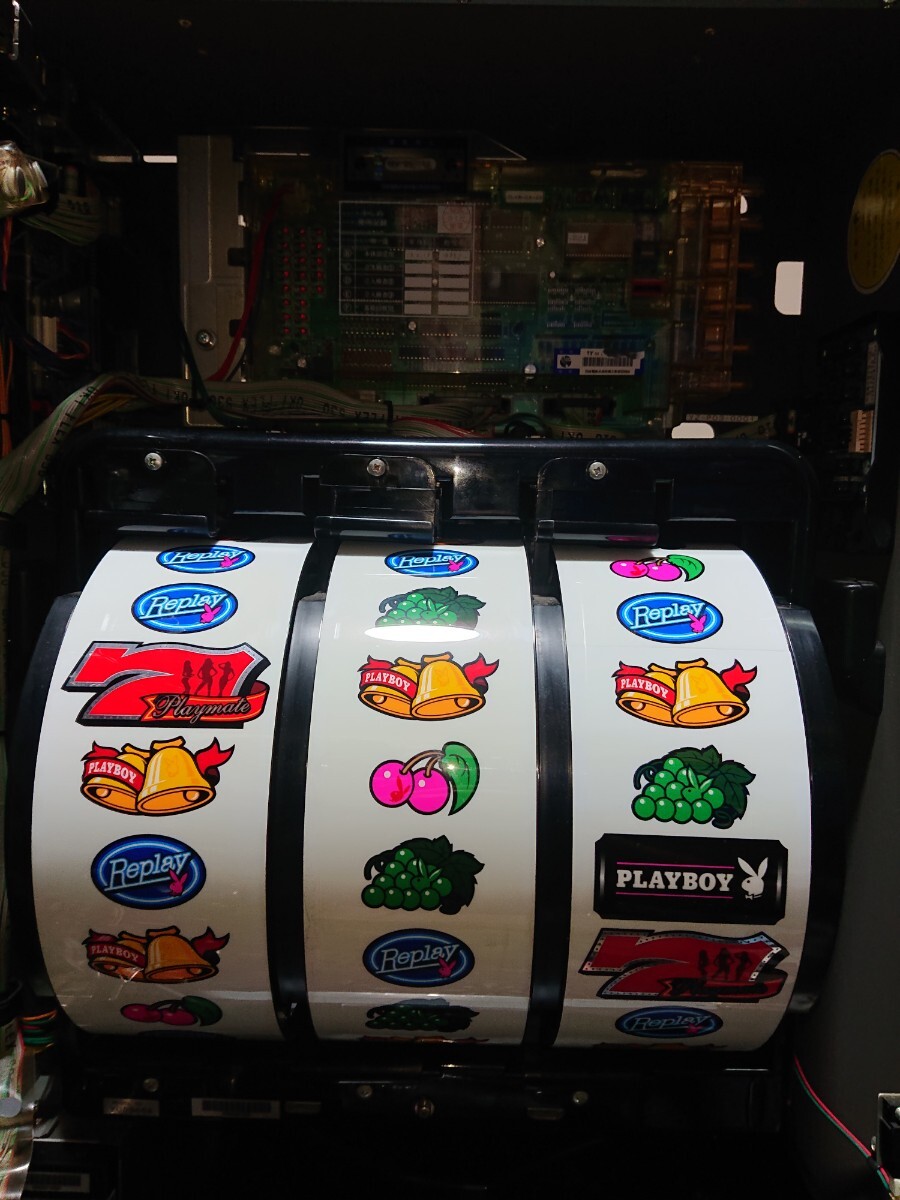 パチスロ実機、プレイボーイ30です。動作確認済みで、リールの回転、ボリューム調整、設定の変更等、問題なく動作致しました。家庭用100V電源対応のコイン不要機付きです。無段階ボリュームは付いています。現状、パネルランプ、リールランプ、キャパシタも問題ありませんでした。台鍵、設定キーは付属致します。配送は福山通運でお送り致します。自宅は福岡県の三潴郡です。御都合宜しければ、自宅お引き取りでも大丈夫です。