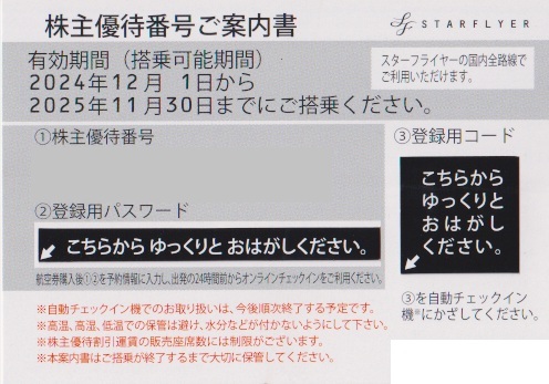 番号通知のみ!! ★SFJ スターフライヤー株主優待券★ 1枚〜4枚まで 有効期限:2025年11月30日 |