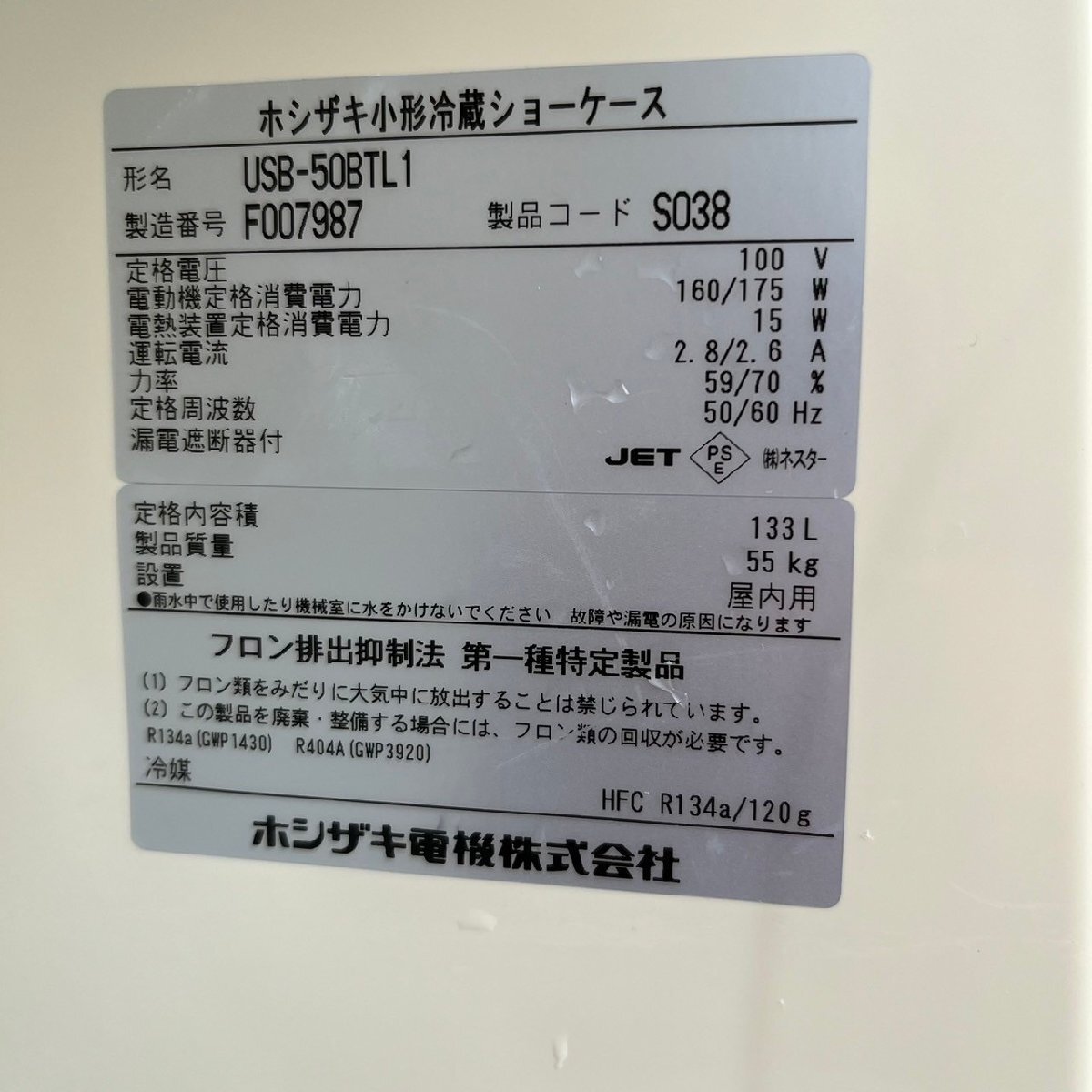 %OG% 美品 ホシザキ 小型冷蔵庫ショーケース USB-50BTL1 中古品 2016年式 100V 50/60Hz 幅500×奥行490×高さ1520 動作確認済み %T-240802