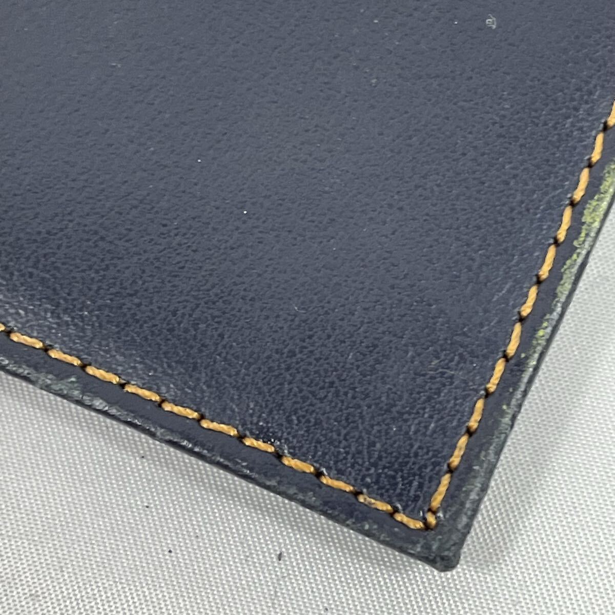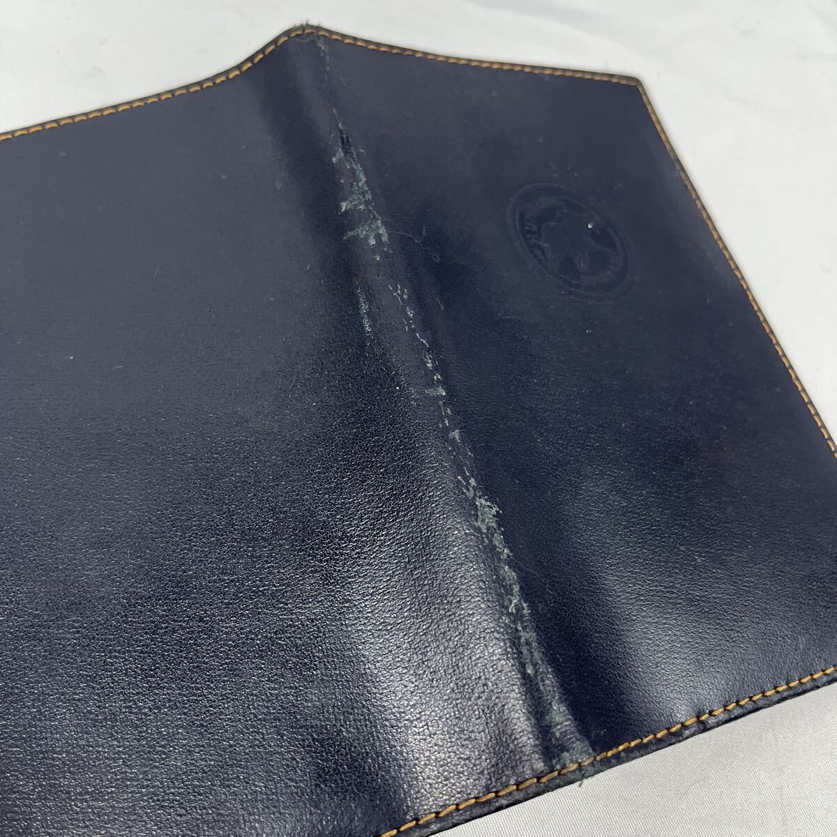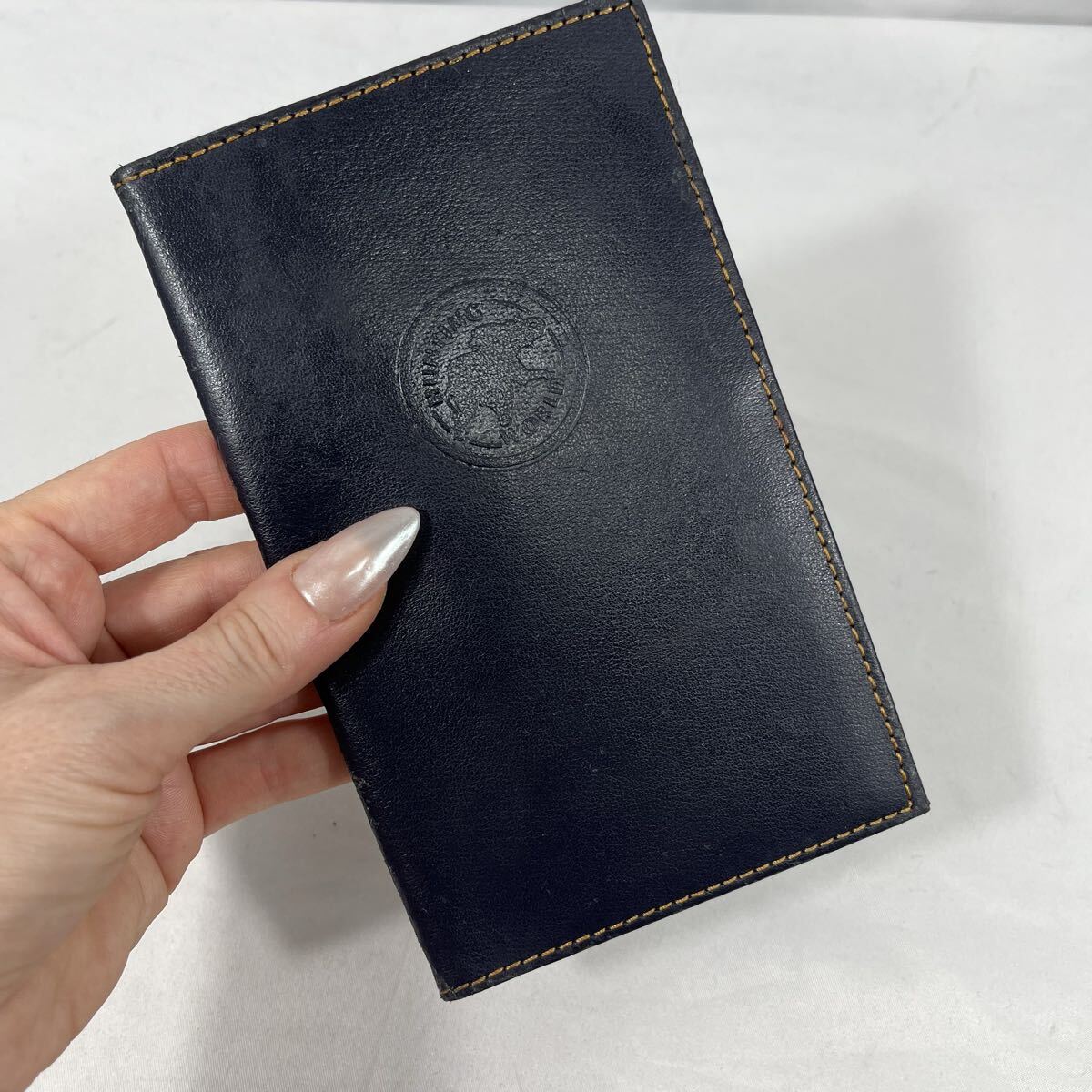 ・ネイビーのレザー製手帳カバー、エンボスロゴ付き。