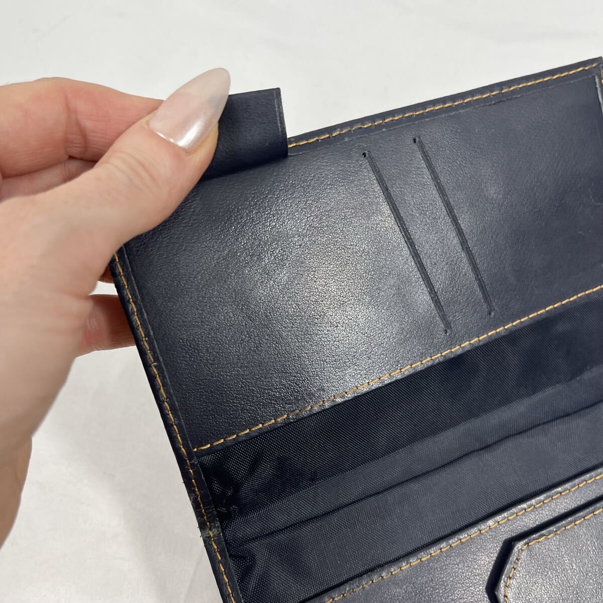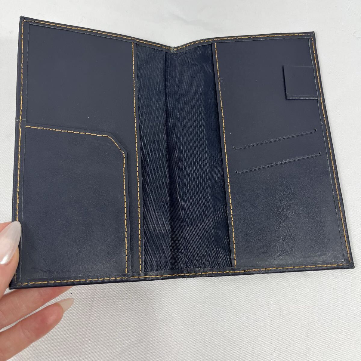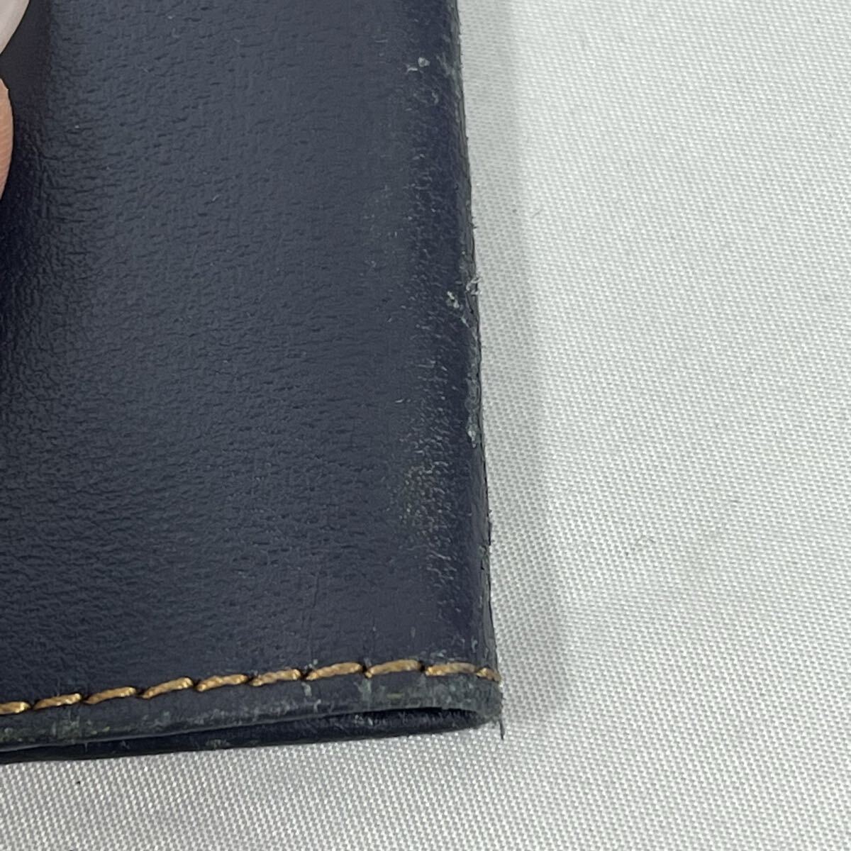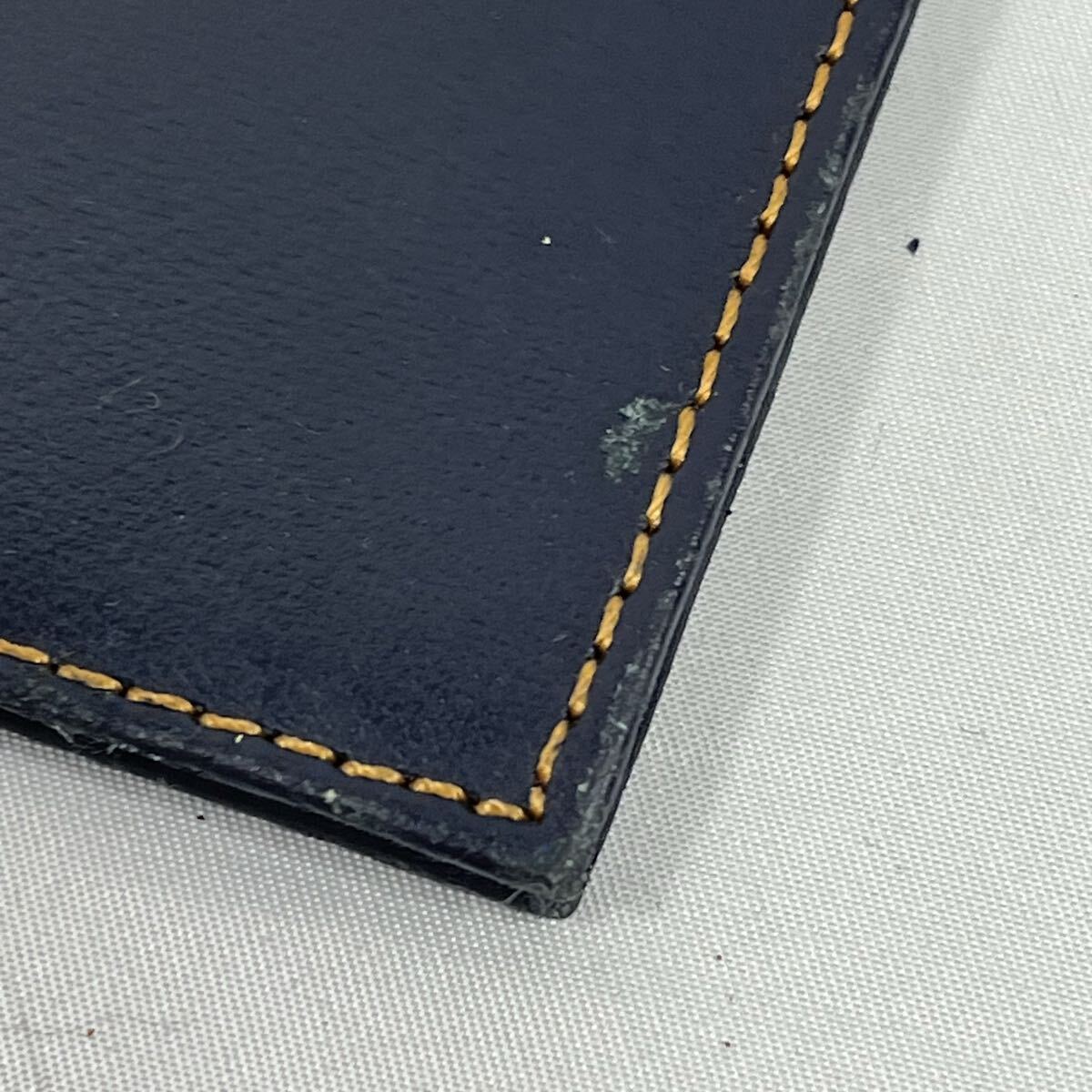 ・ネイビーのレザー製手帳カバー、エンボスロゴ付き。