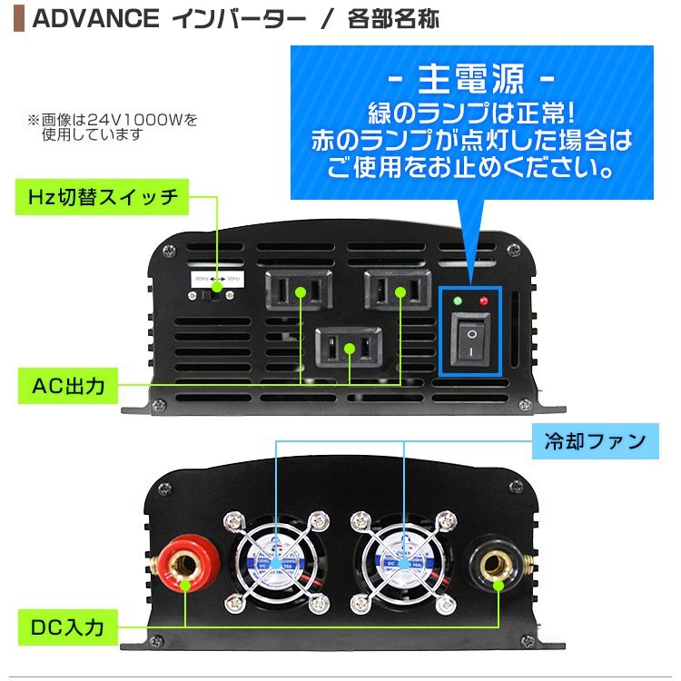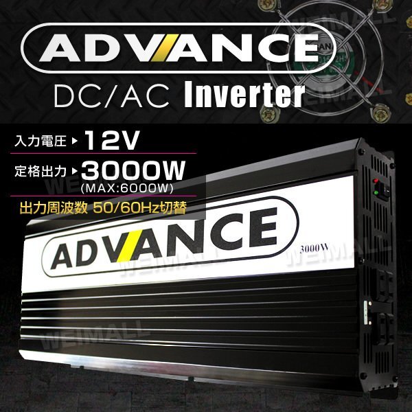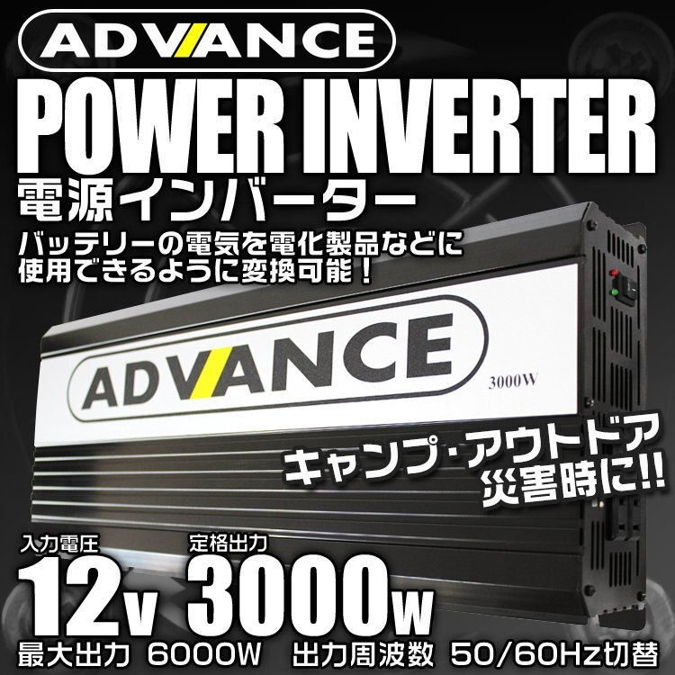 \ バッテリーの直流12Vを交流100Vに変換!/ コンセント4個付で同時に4台の電化製品が使用可能! アウトドアはもちろん、緊急時や災害時などにも大活躍♪ 【商品コード】C10A 【商品詳細】 寸法:530mm(L)×225mm(W)×90mm(H) AC100Vコンセント ×4 入力電圧:DC12V 出力電圧:AC100V 定格出力:3000w 最大出力:6000w 出力周波数:スイッチで50Hz/60Hz 変換可能 出力波形:矩形波(疑似正弦波) ケース:アルミ製 【機能】 回路保護 入力低電圧警報音 低電圧遮断 過温度遮断 過負荷遮断 短絡遮断 入力過電圧保護 入力逆接続保護機能 【内容】 インバーター本体 ×1 電源コード ×4 【注意事項】 ・海外製品のため多少の傷、汚れがある場合がございますがご了承ください。 ・商品は、モニターによって色合いが異なって見える場合があります。 ・仕様・デザインは改良のため予告なく変更することがあります。 【もちろん新品未使用品です】 |