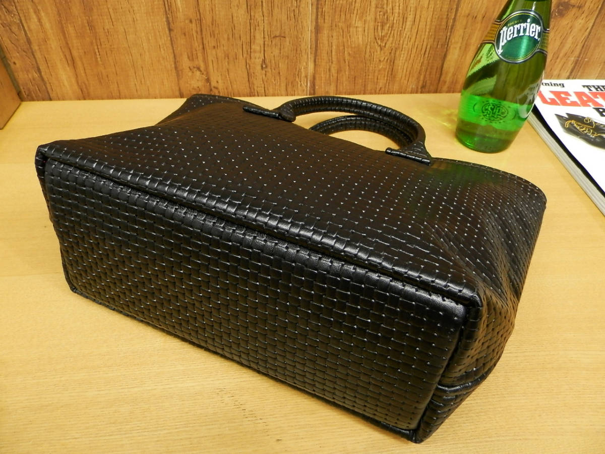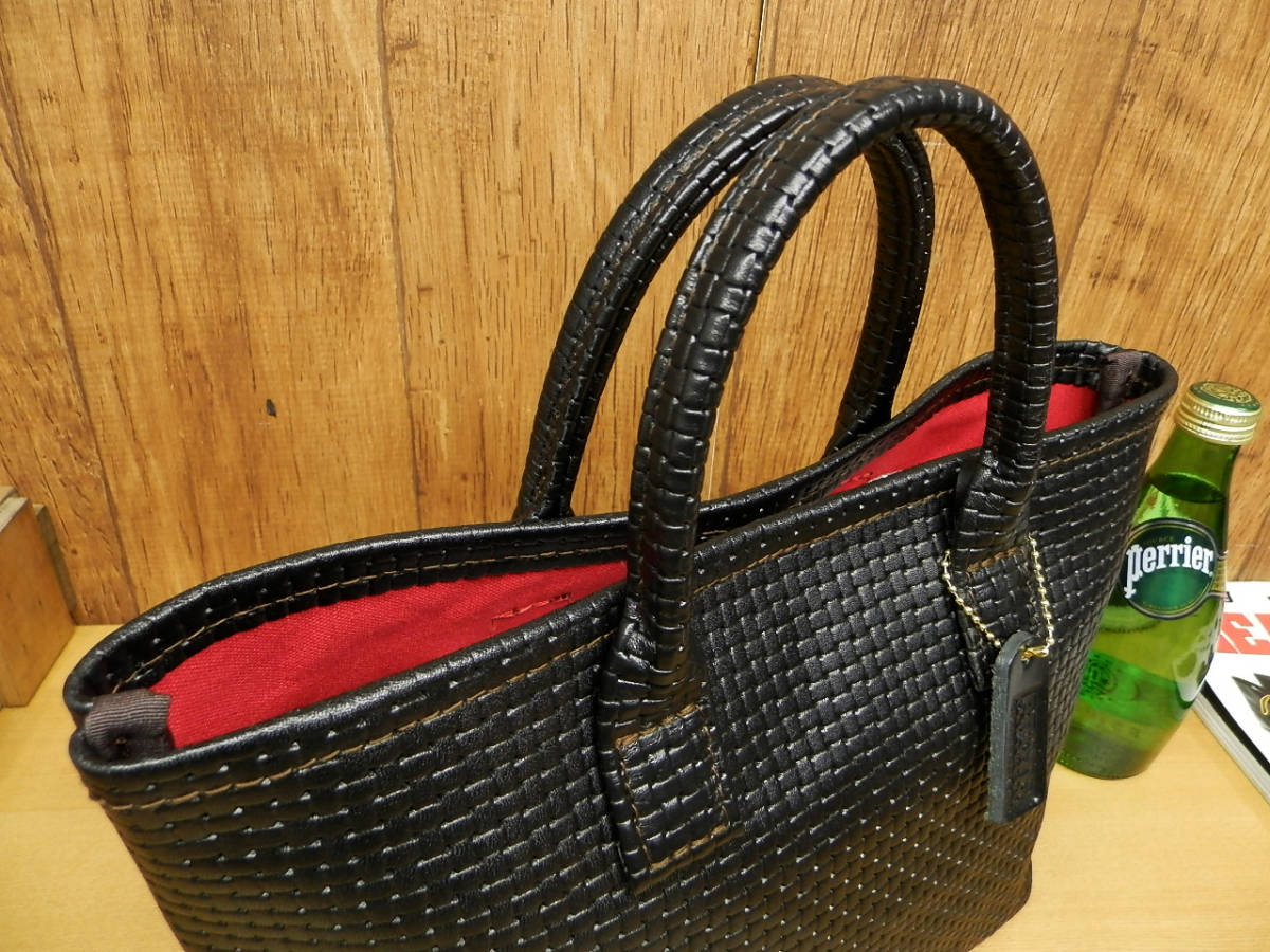 ☆レッド裏地☆上品なメッシュ柄レザーのミニトートバッグSサイズ牛革オールレザー日本製イントレチャート柄 ブラック黒