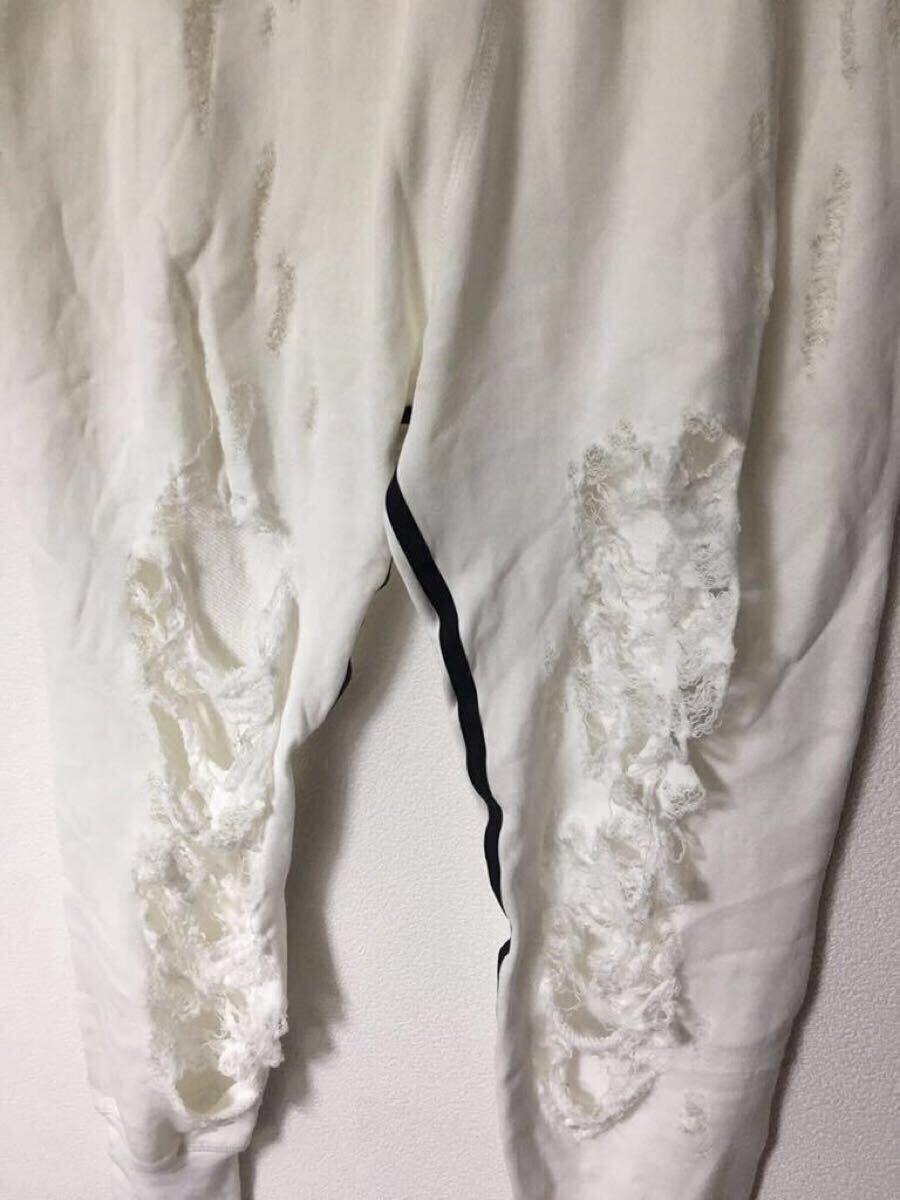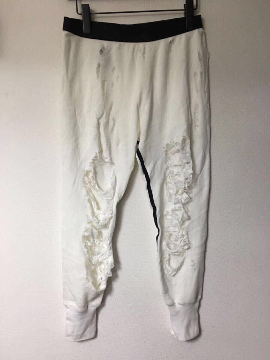 薄手なスウェットに内にライン、フロントなどダメージの入ったイージーなパンツです。