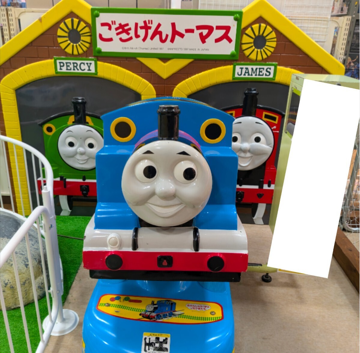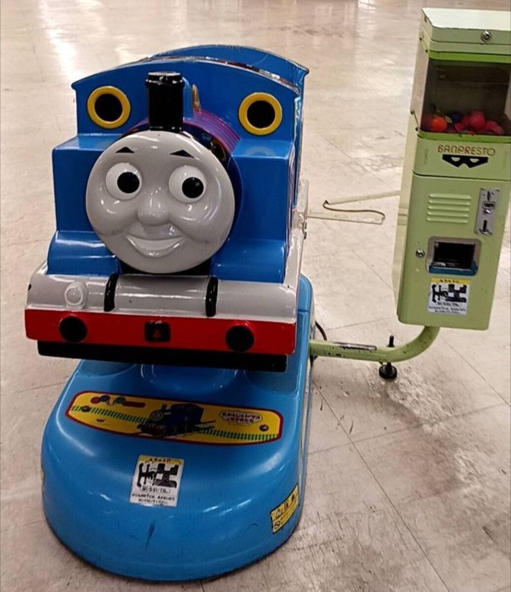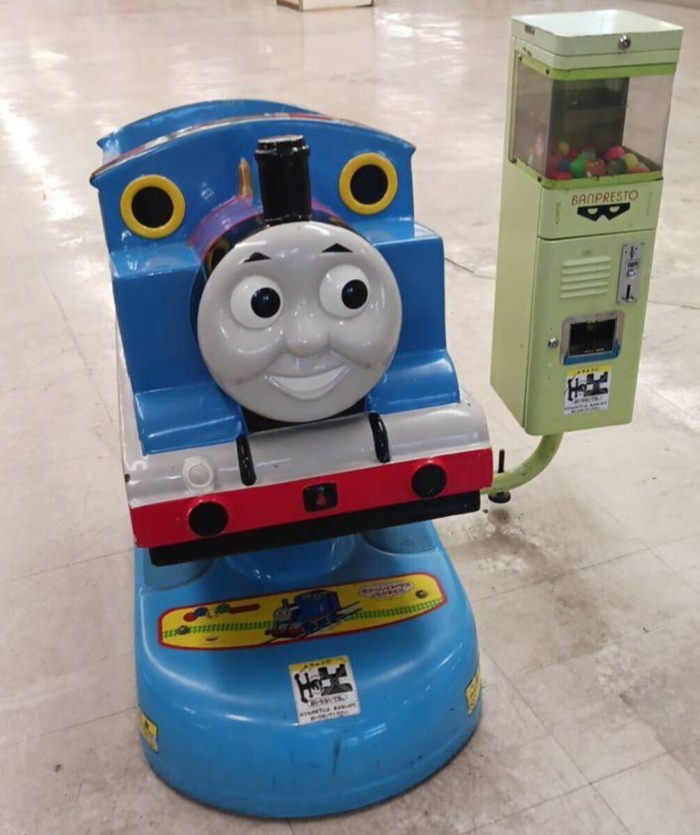 乗物トーマスとめずらしいパーシーとジェームスのパネル付です。お金を入れたらカプセルを払い出し動きます。