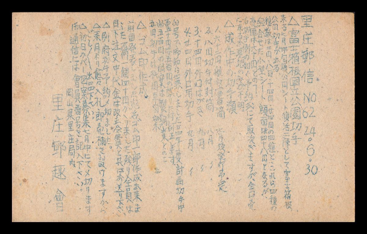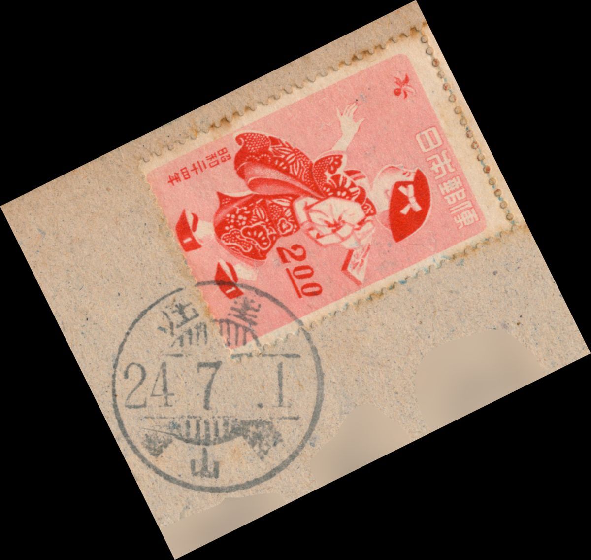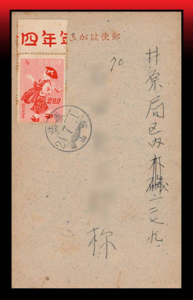 ●S24年用年賀羽根突き2円上耳紙付/私製葉書 櫛型印:(里庄)/24.7.1/(岡)山(縣)※局名は住所〜 エンタイア