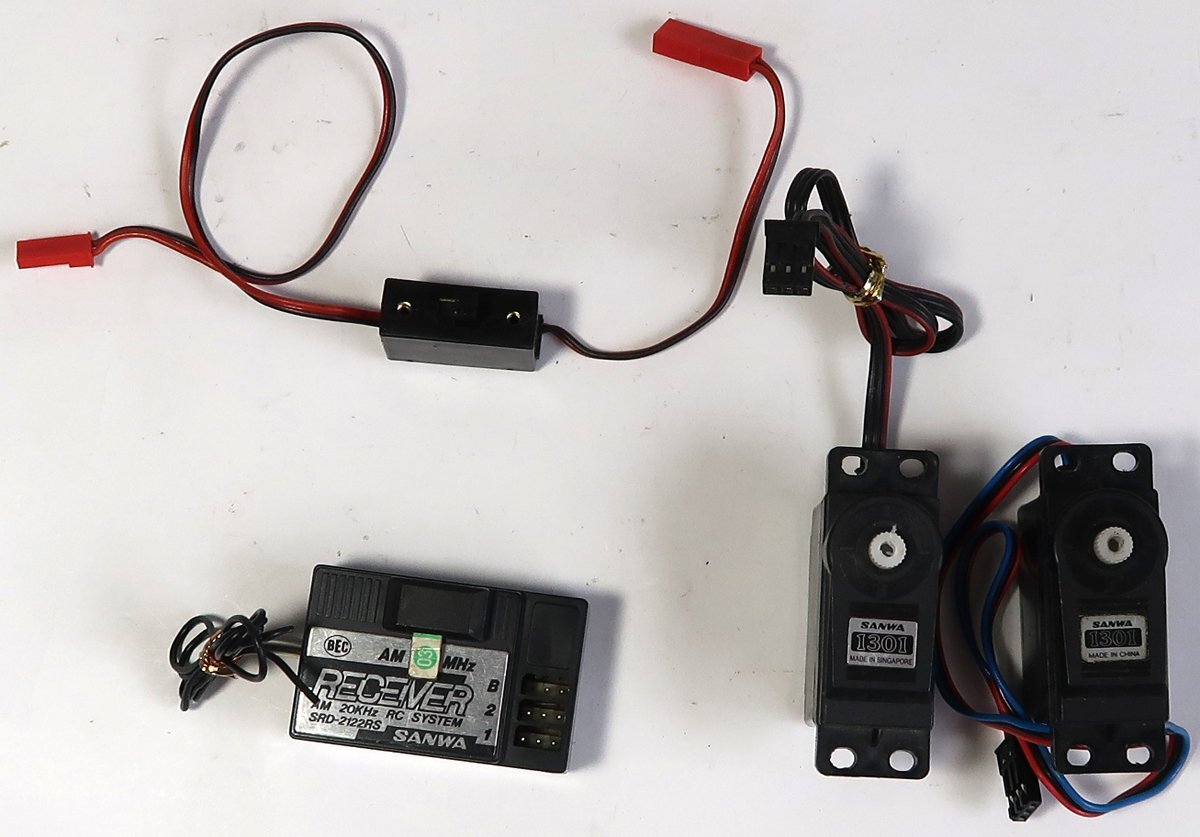 出品は画像の物が全てです。電池ケースはないです。他に必要なものがあればご自分でご用意ください。使用品ですので多少の汚れや擦り傷は有ります。サーボは1301です。受信機はSRD-21122RSです。この状態でテストしましたが操作はできましたし、動作しております。ただアンプの動作が前進しか動作しませんでした。調整で変えられるのかわかりません。バンドは3が付属します。出品前にもきちんと基本的な事は問題ないかチェックした上で出品していますが、発送後になにか問題がありましてもサポートは出来ませんし、返品やクレームは一切受け入れられませんのでそれを納得した上で御入札下さい。