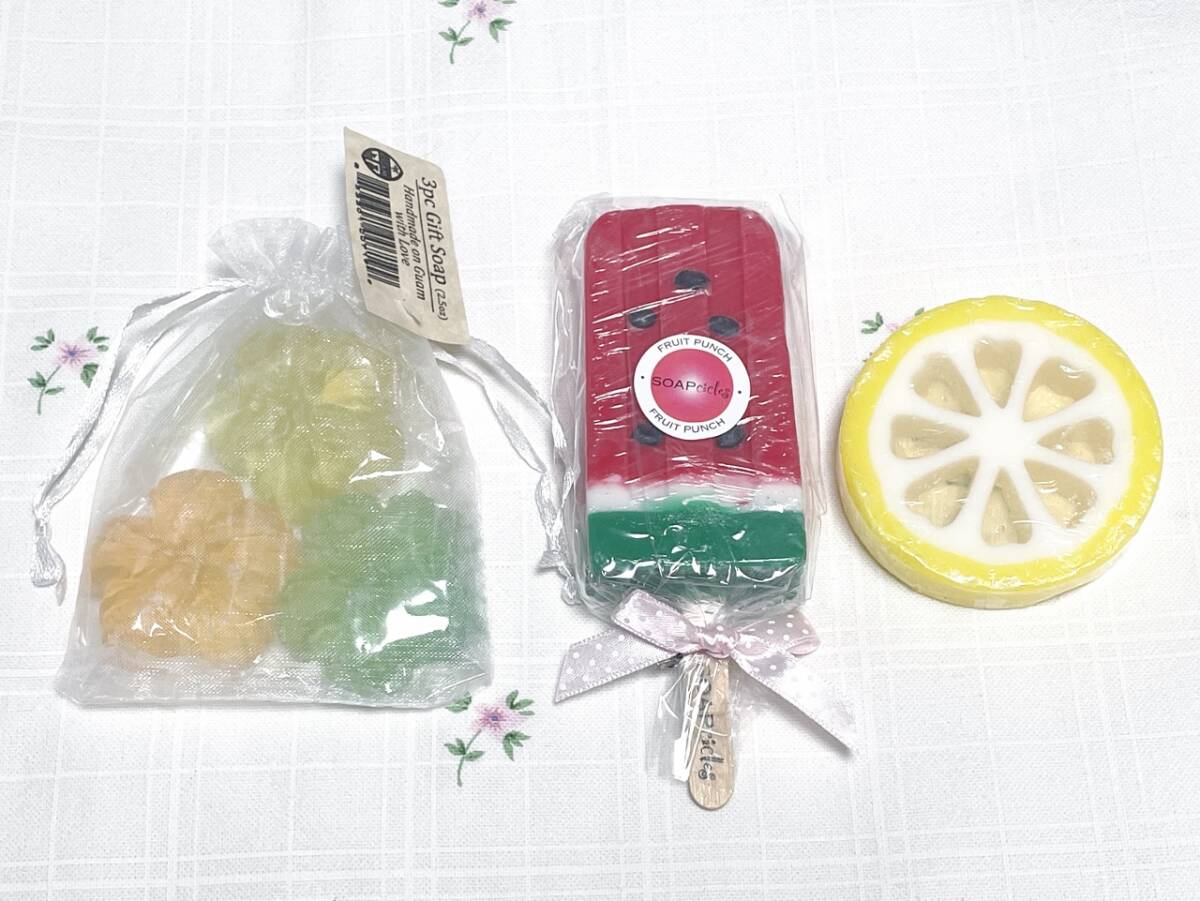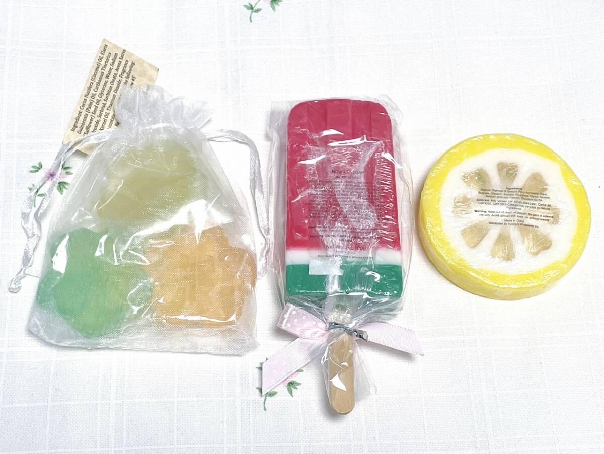 ハイビスカス、スイカ、レモンの石けんの3点セットです