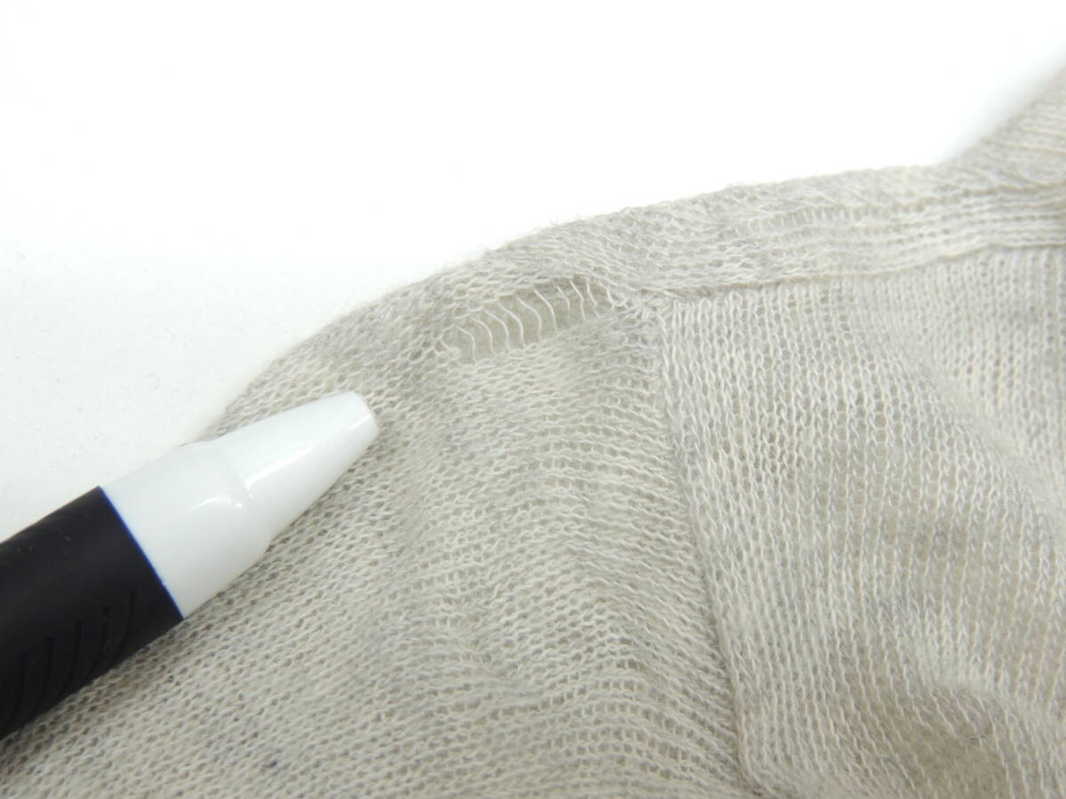 丁寧に検品してその他には、小穴傷のようなものは無いと確認していますが(ニットの小さい緩み隙間程度)、やわらかい薄手ニットなのでわずかな漏れはご容赦ください。