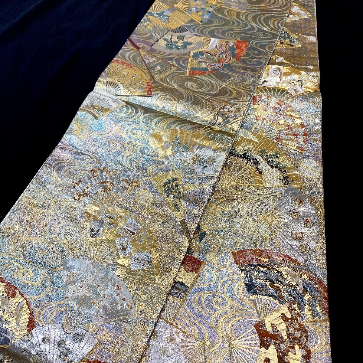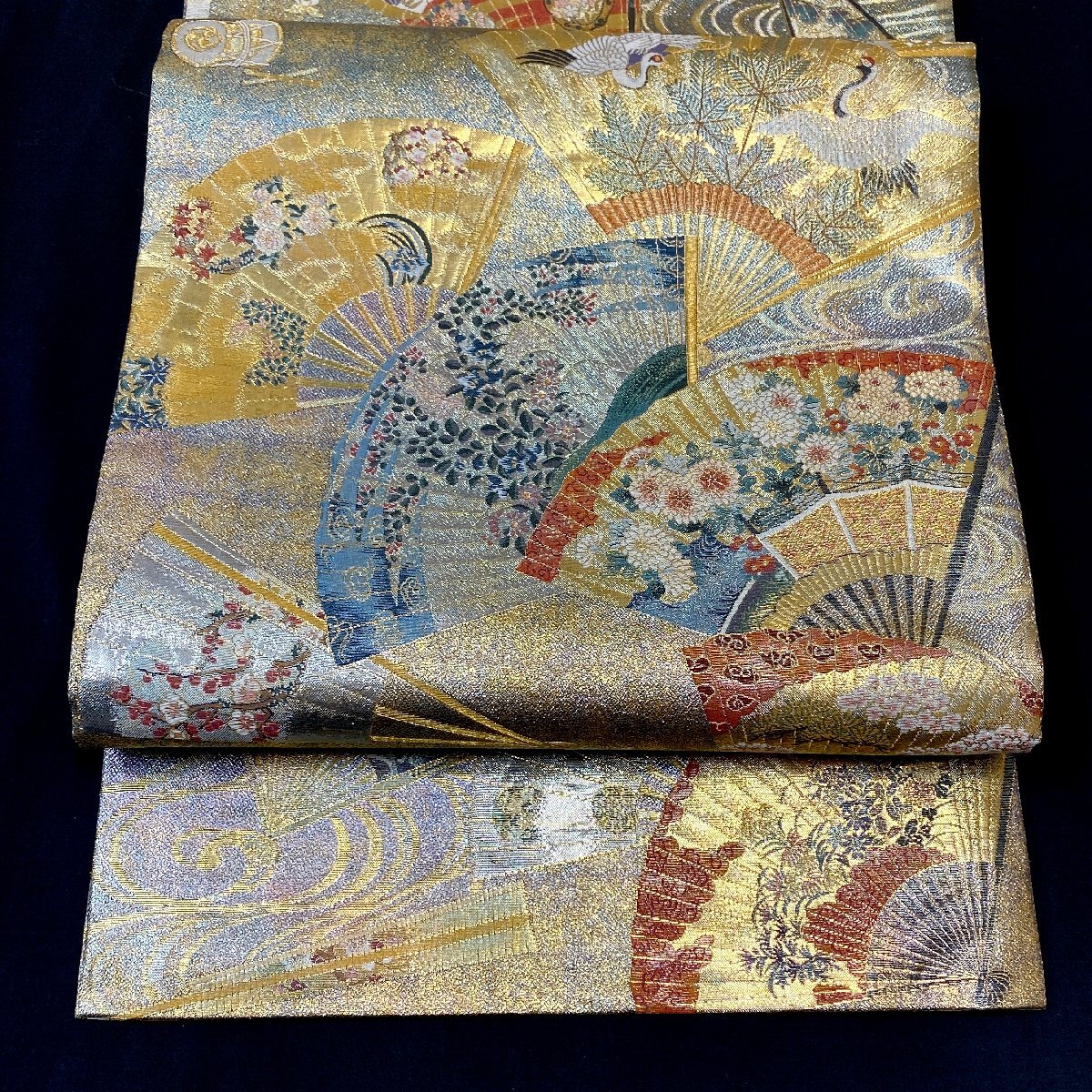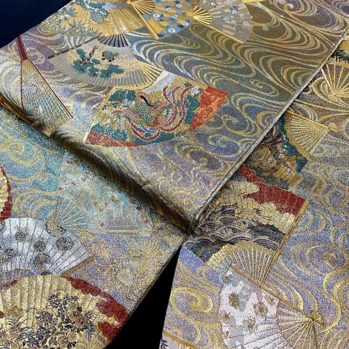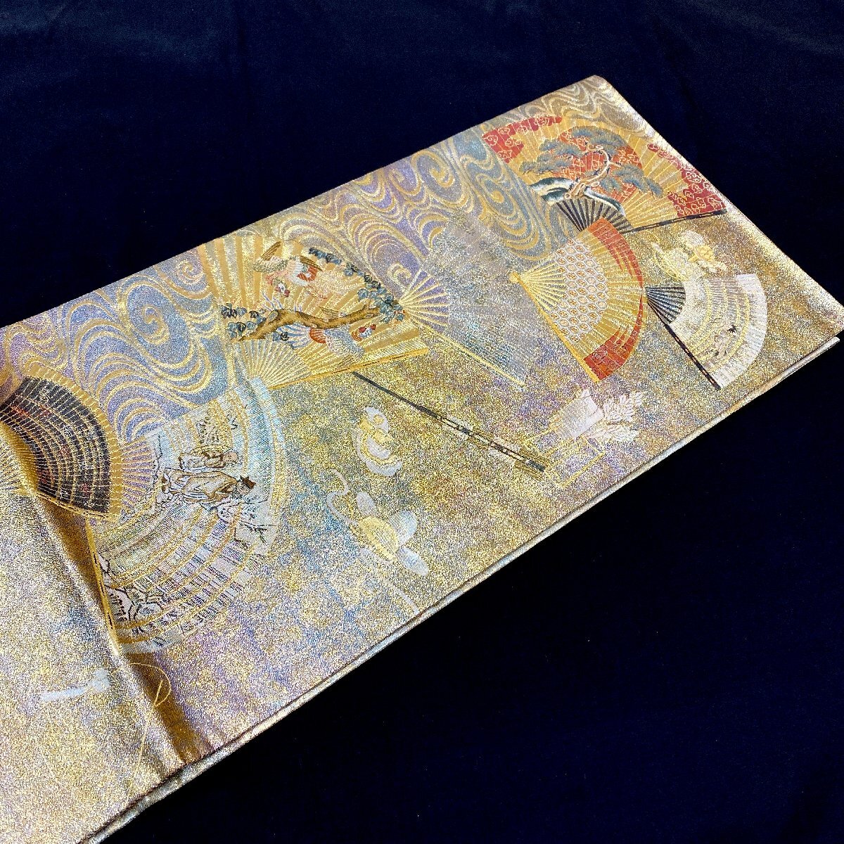 着物月花 あさぎ 徳川美術館秘蔵 能楽百扇 24金プラチナ二重箔 袋帯 未使用品 全通柄 正絹 金銀糸 西陣織物 ob7164