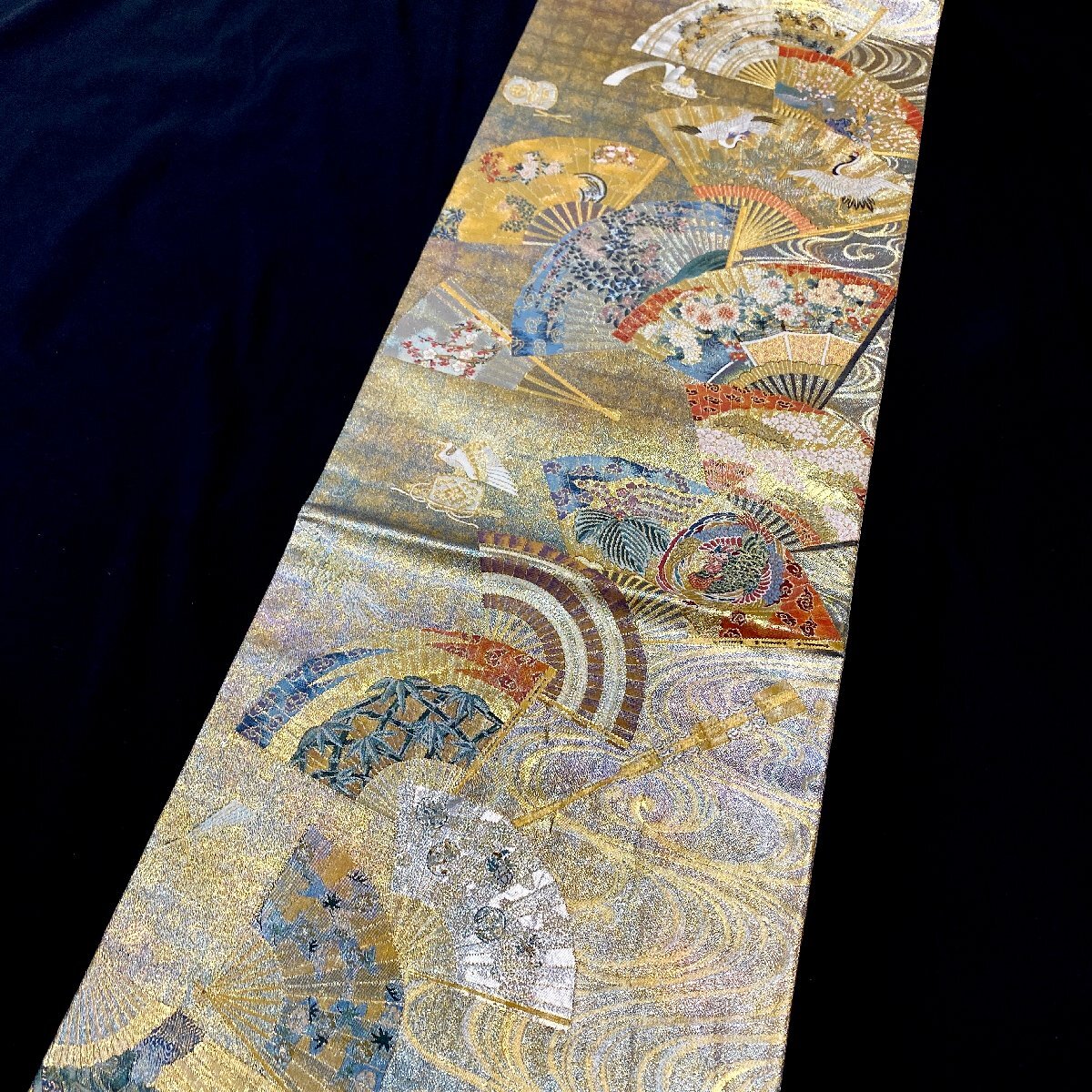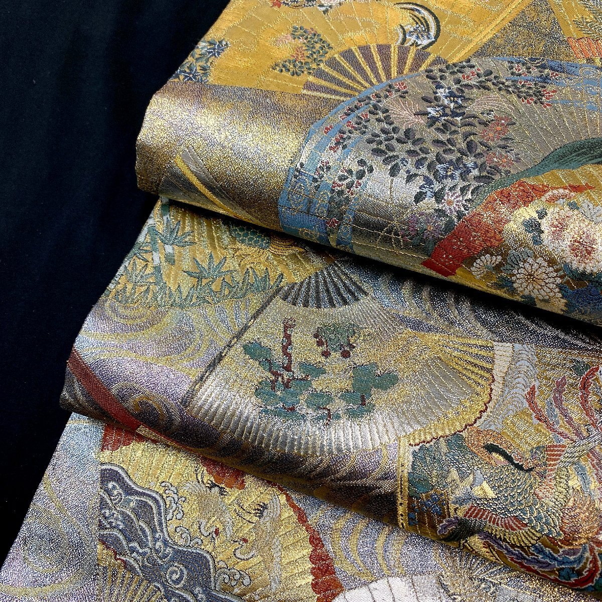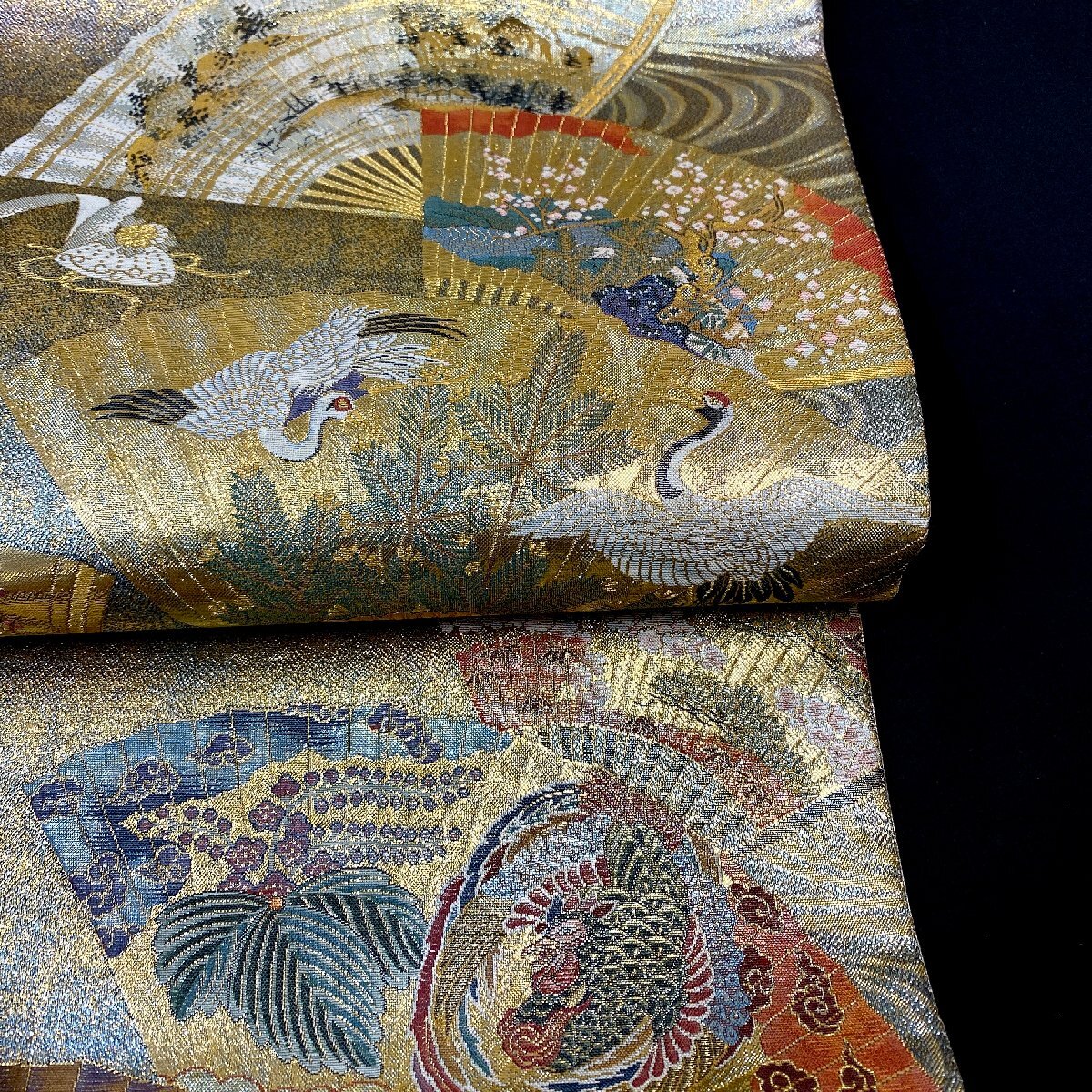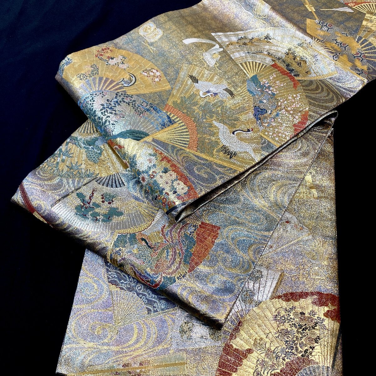 着物月花 あさぎ 徳川美術館秘蔵 能楽百扇 24金プラチナ二重箔 袋帯 未使用品 全通柄 正絹 金銀糸 西陣織物 ob7164