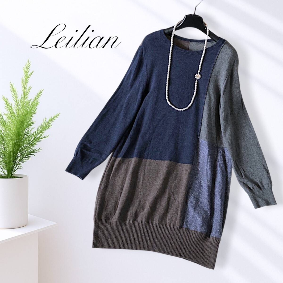 B20◆美品 レリアン Leilian プラスハウス 大きいサイズ 13+ XL LL ゆったり ウール ニット チュニック ワンピース 伸縮 ストレッチ パネル