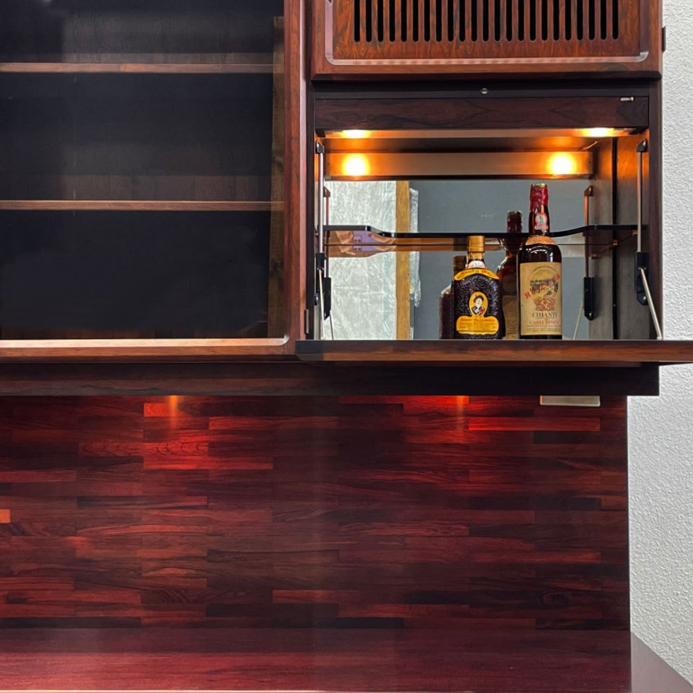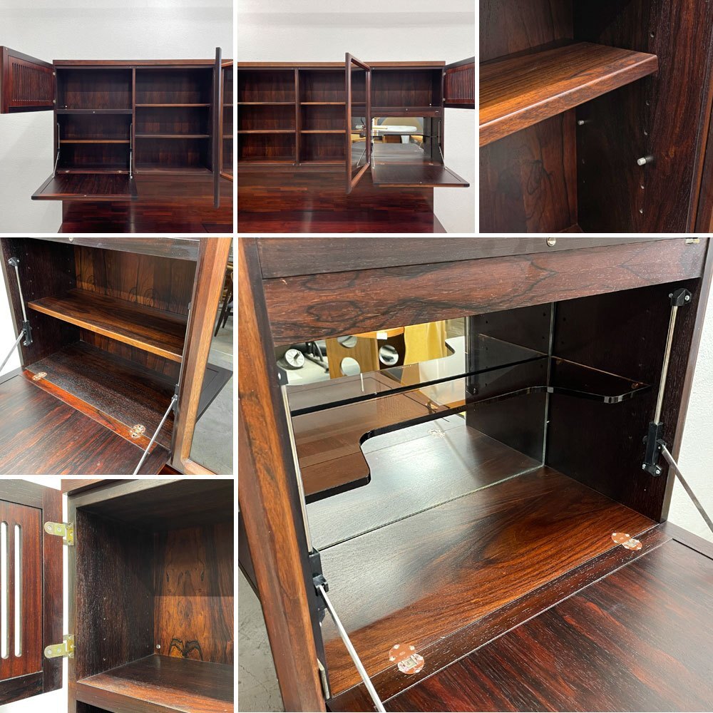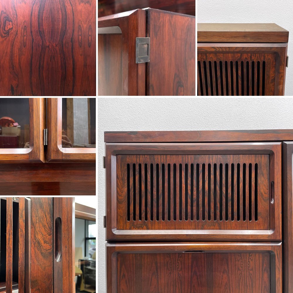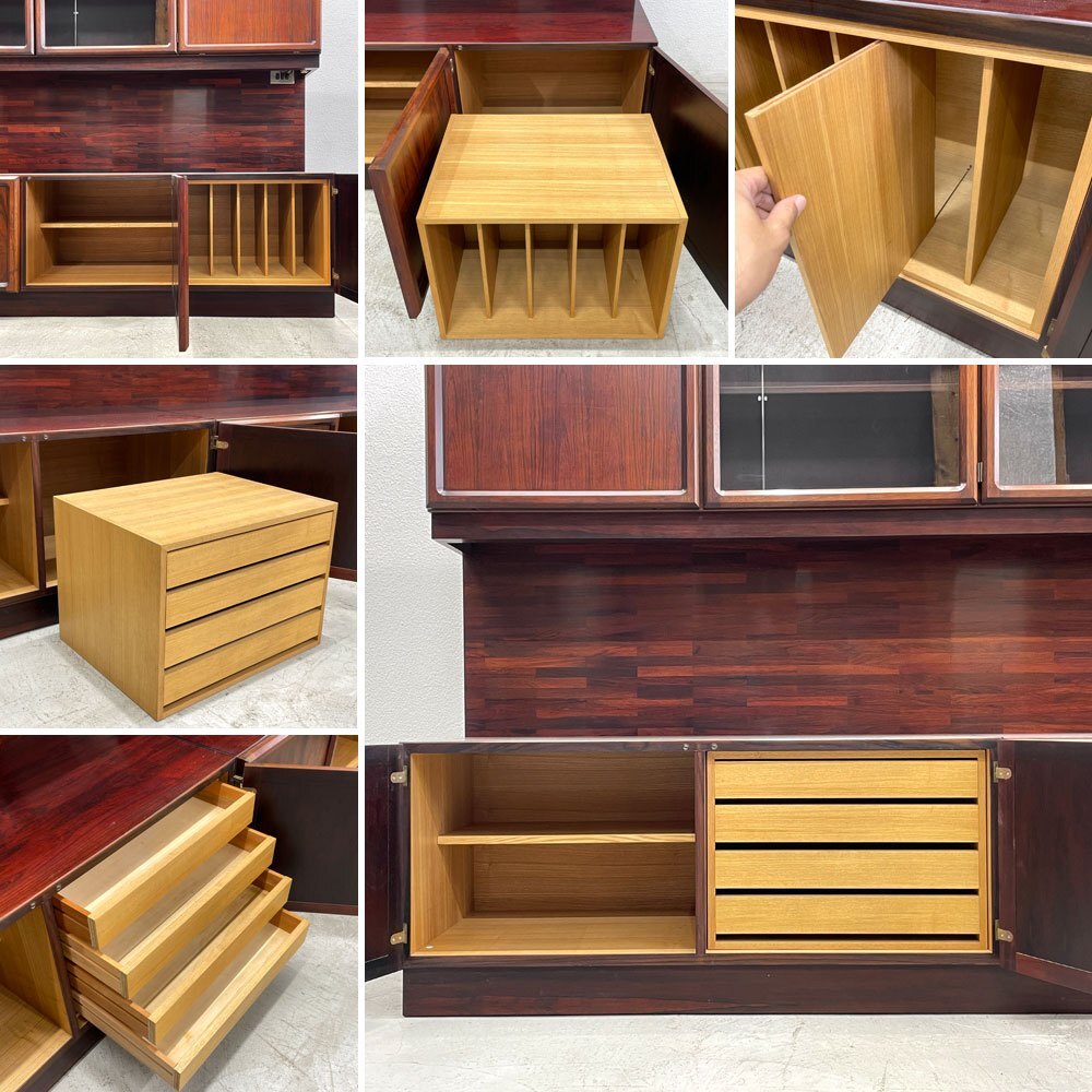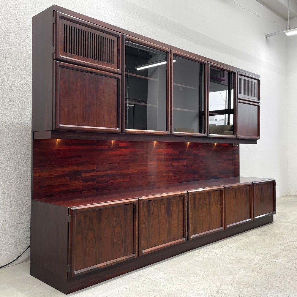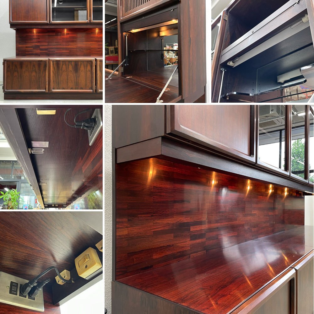 コメント | イタリアの高級家具ブランド・BERNINI(ベルニーニ)社製品の国内製造を手掛けるなど、質の高い製造技術で国内外から評価を得ていたメーカー、山品木工(やましなもっこう)。 惜しまれつつも1996年に廃業となりましたが、ローズウッド材を使用した北欧スタイルの家具が再注目されています。 こちらは1970-80年代に作られたと思われる「マルチラックペガサス」。幅300cmの圧巻のサイズを誇るビンテージの大型ストレージです。 システムキャビネットとして扉の仕様や収納部の並びをカスタムできたようですが、今回は上段のサイドに木製開き戸とドロップダウン扉、中央にガラス扉3枚を配したモデル。とくに向かって右側のドロップダウン部分はミラーバックデザインで、バーキャビネットのような雰囲気をお楽しみいただけます。 さらに、中央のオープンスペースには上部に照明が付属しあかりを灯すことも可能。下段の扉を開けると、オープン棚や4段抽斗、縦型収納などそれぞれに異なる収納部が出現します。 なお左右に2列と3列、中央のオープン部を境に上下で分解ができるため、搬入出の心配も軽減されるかと思います。 おそらくお酒や音楽を楽しむためのリビングボードとして活躍していたであろうキャビネット。高級感あふれるローズウッドの木味や年月が経っても狂いの少ない職人技など、随所にビンテージならではの魅力が光る1台です。 ※当ショップは、主にリサイクル品を取り扱っております。基本的にUSED品である事をご理解頂き、ご入札をご検討下さいませ。 |