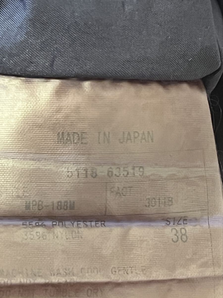 ウェットな質感と、シャカシャカとした化繊特有の肌触りがうまくミックスされた独特な素材です。製品縫製後に後染めを施し、若干のムラを残した奥行きのある色味や、全体にゴワゴワとしたシワ、特に縫製部分の強いシワと歪みが、色気を持たせています。