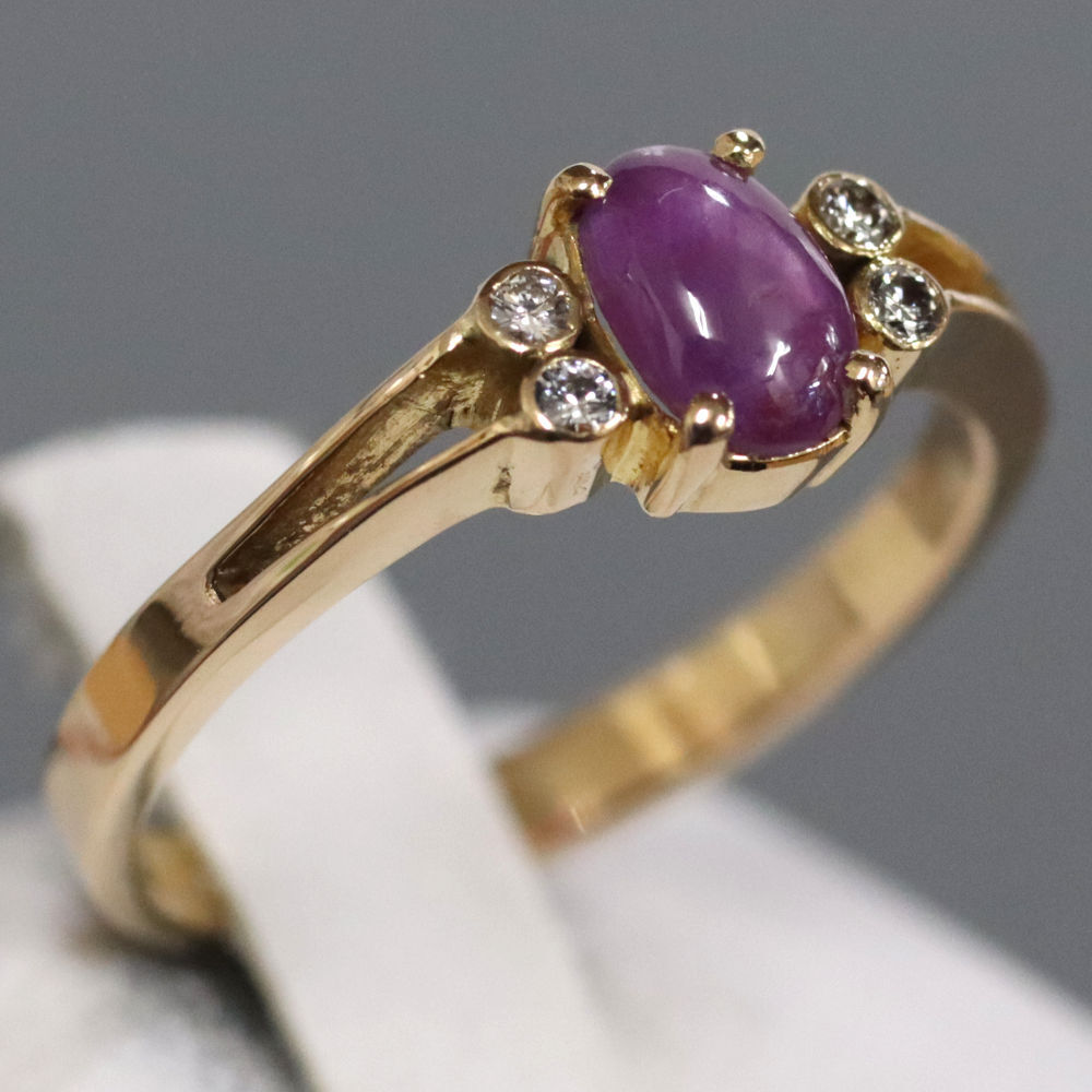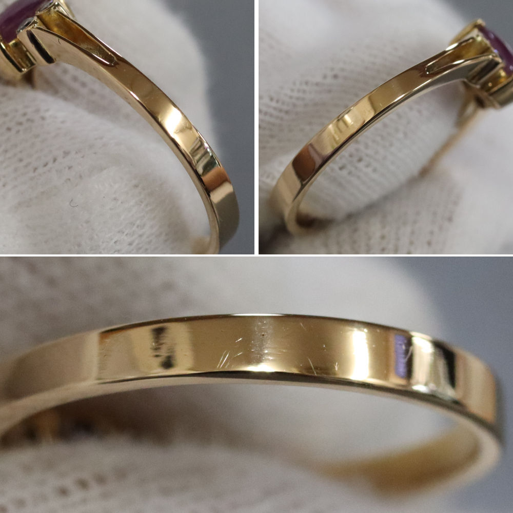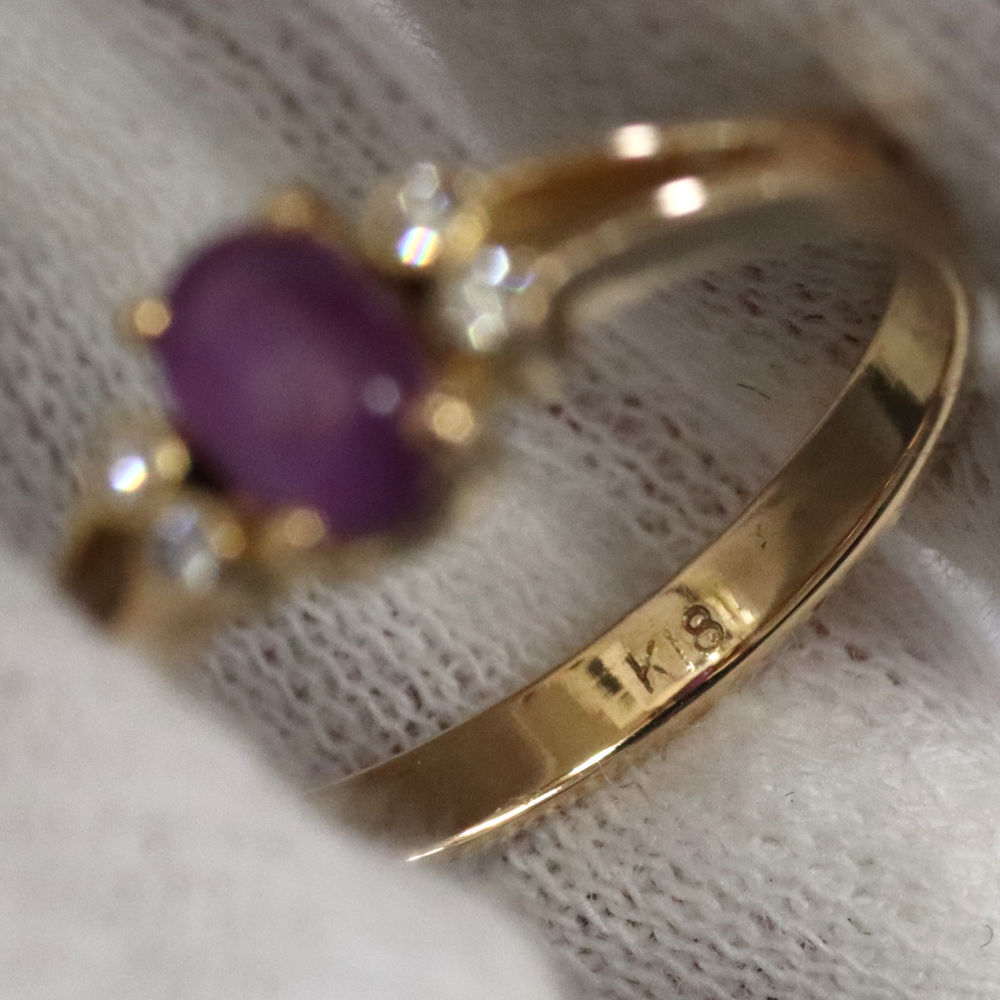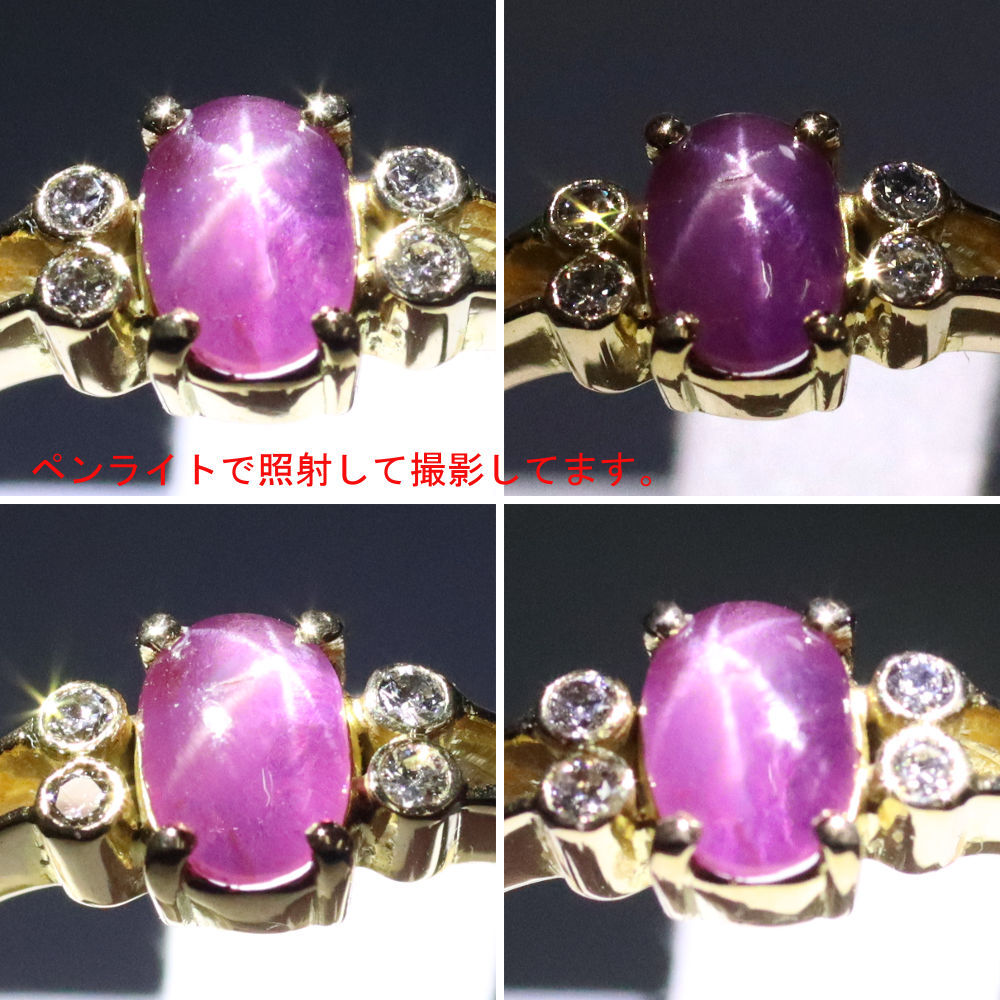 K18スタールビーダイヤモンドリングの中古品です。 太陽光下ではスターは見えず、強い光を当てることによって6条の光が見えます。 スタールビーに傷があり、目でも見えます。 ゴールドのお色味はピンクゴールドです。 石目の刻印はありません。 地金に小傷があります。