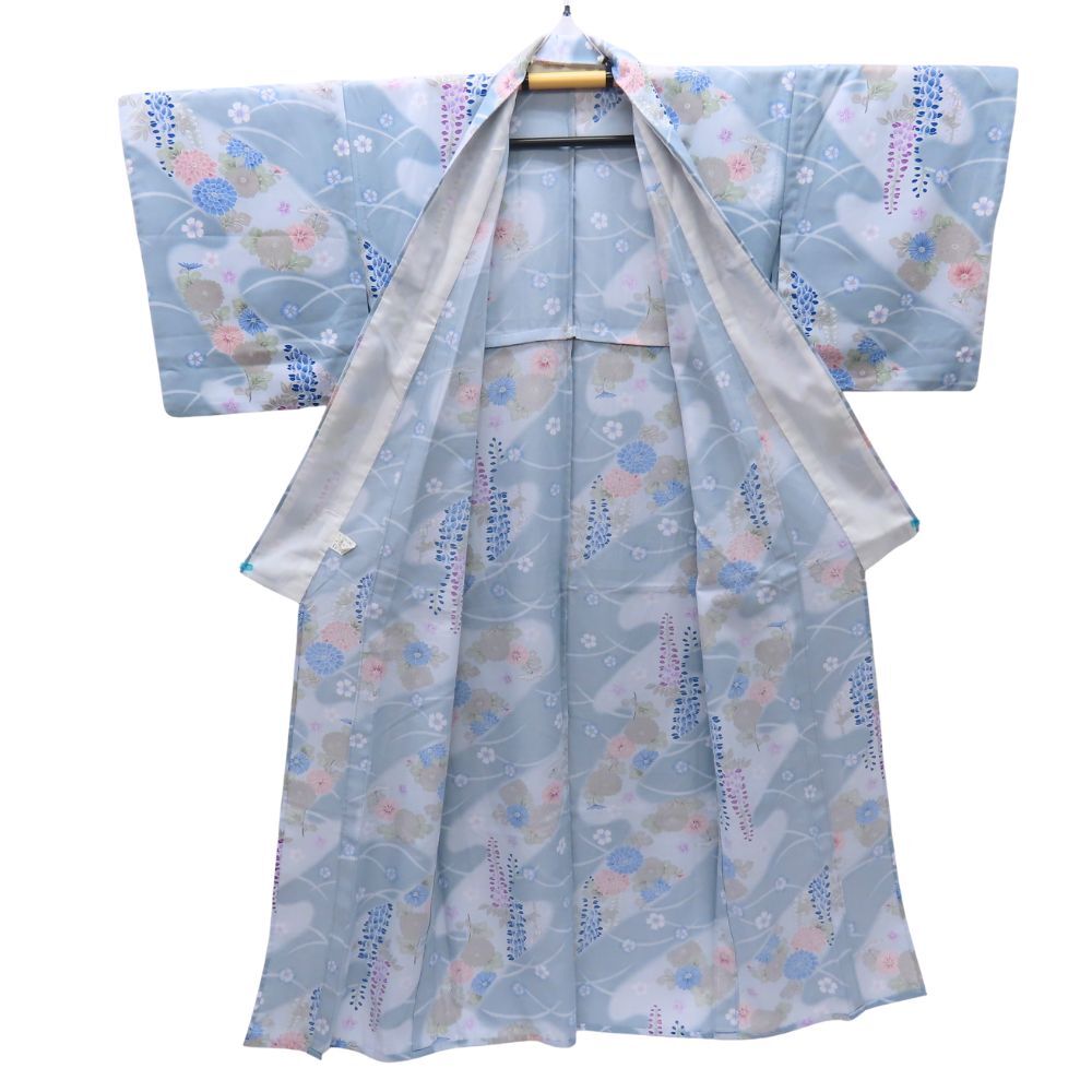 中古 小紋 化学繊維 ブルーグレー系 グレー 花 藤 和装 呉服 和服 きもの レディース 女性