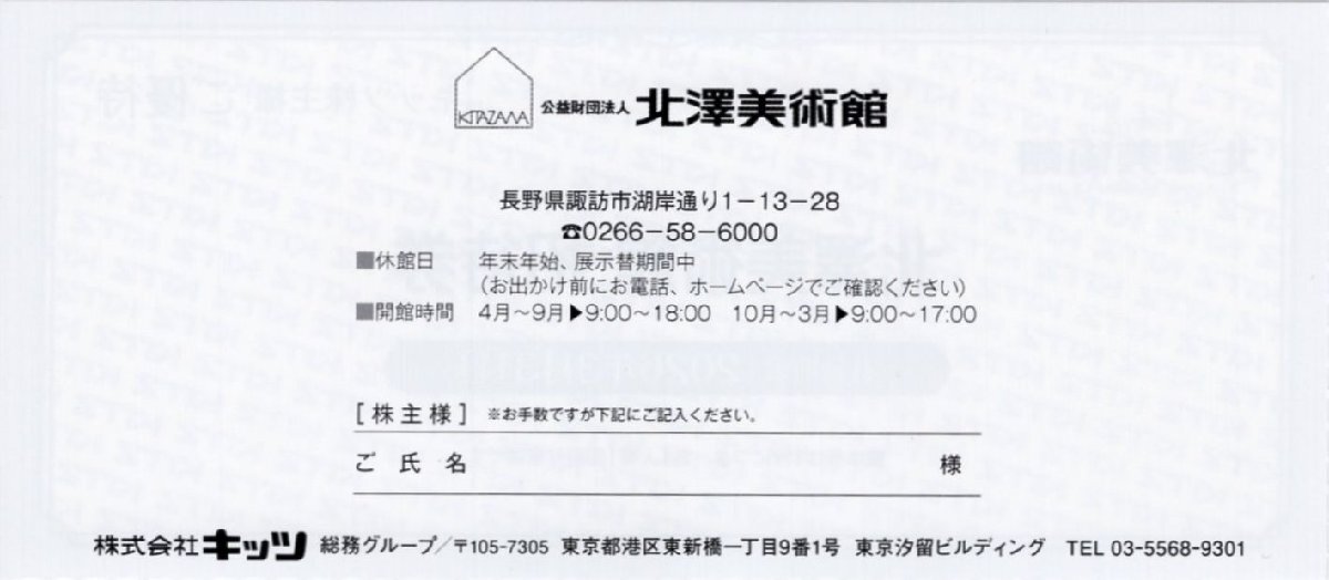 ・株式会社キッツ 株主様用「北澤美術館」ご招待券です。