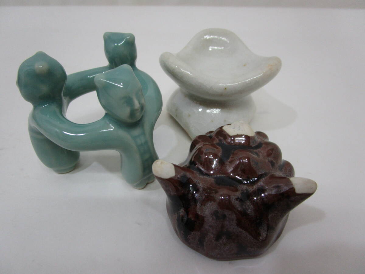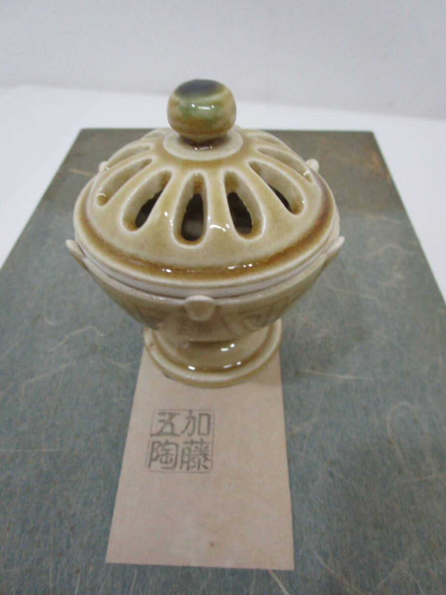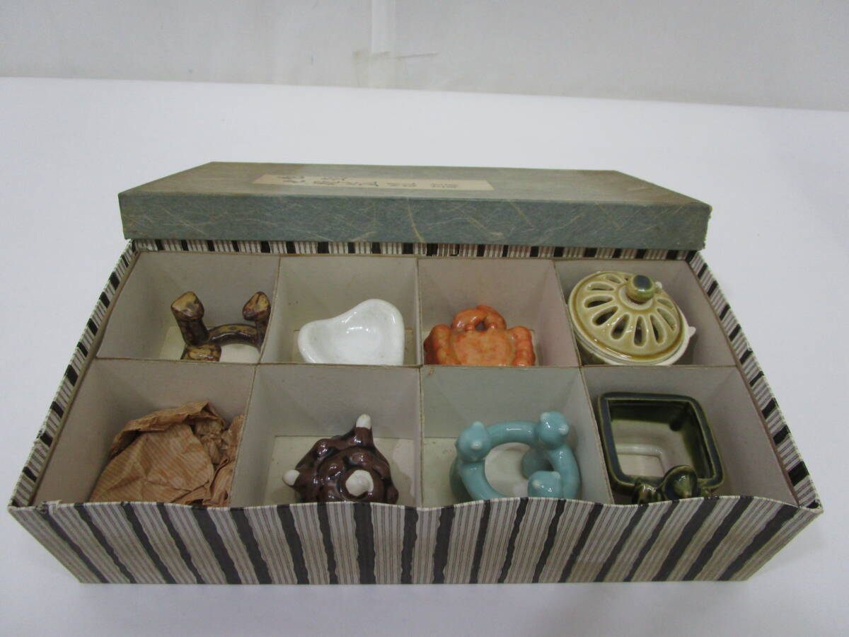 中古茶道具!瀬戸焼  加藤五陶作の 色変り 七種蓋置です。 化粧箱のサイズ16cm×31.5cm 高さ7.5cm   ★ 保管場所の影響で化粧箱は大変ヤケ汚れています。御了承下さい。 蓋置は使用感少なく 良品です。  どうぞ宜しく。