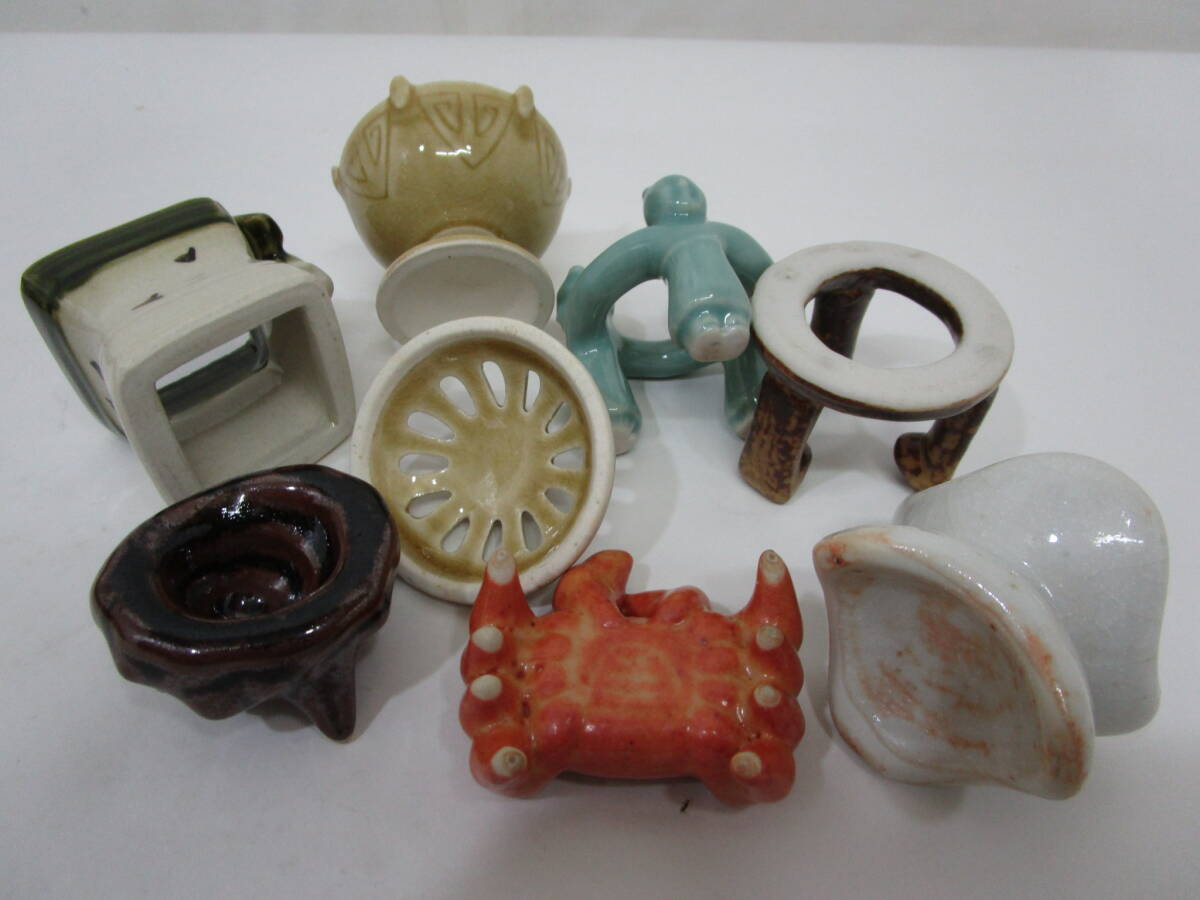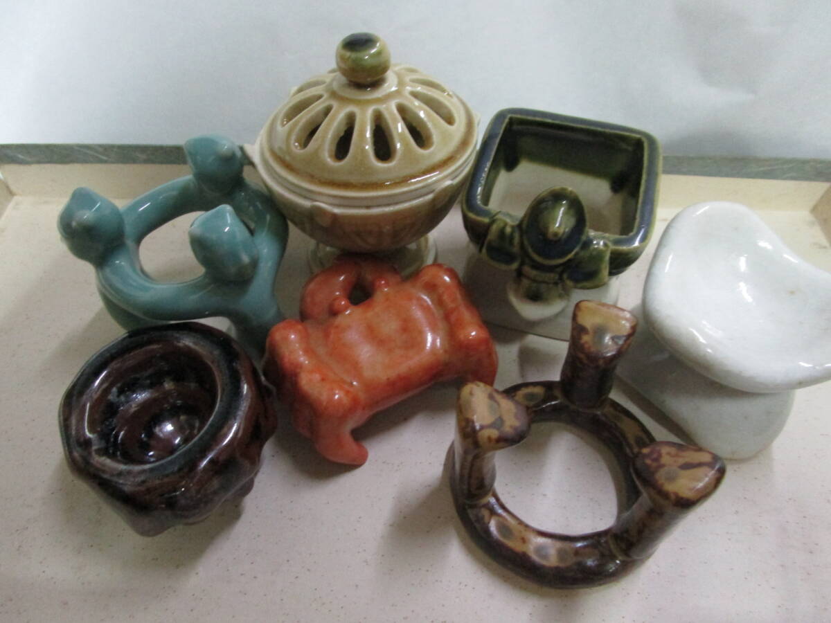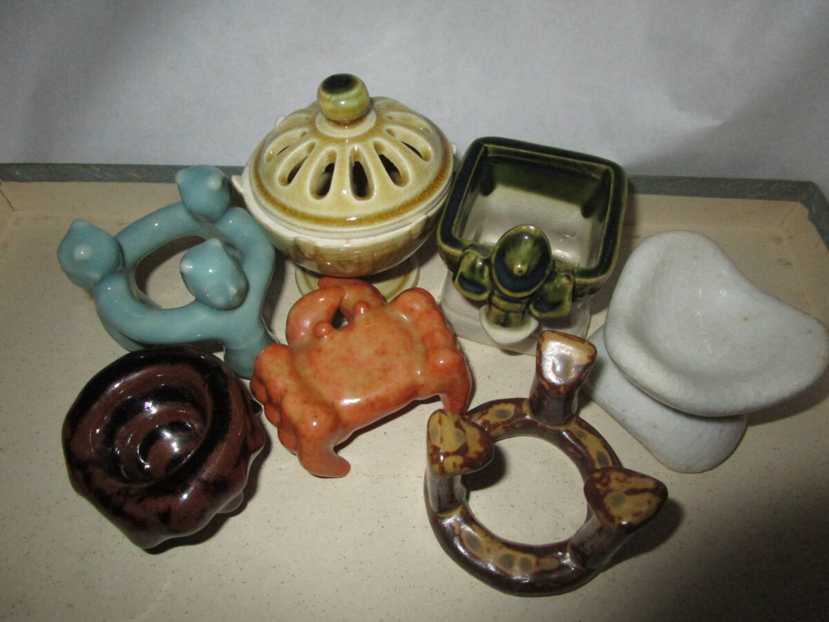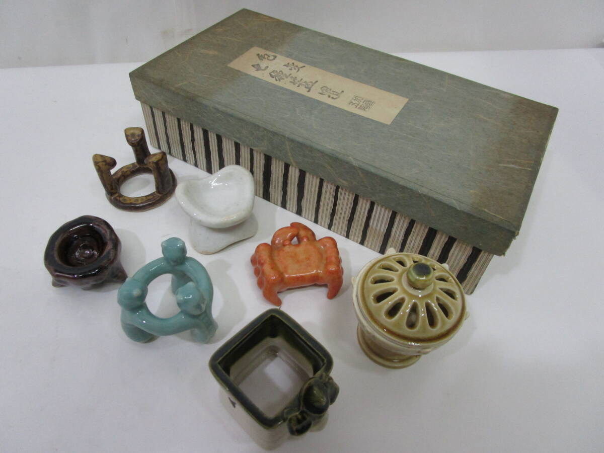 内訳: 「黄瀬戸・火舎香炉」  「伊羅保・五徳」  「志野・三葉」  「織部・一閑人」  「古瀬戸・栄螺」  「青磁・三人形」  「紅志野・蟹」