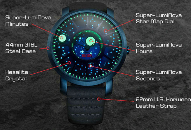 特殊な形状の秒針と長短針によって、広大な宇宙と満天の星空を文字盤の上に再現したロマン溢れるギミックで、