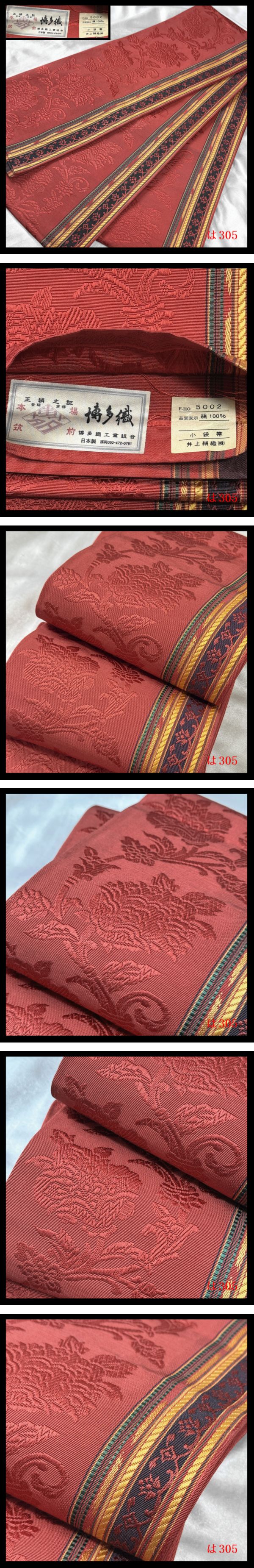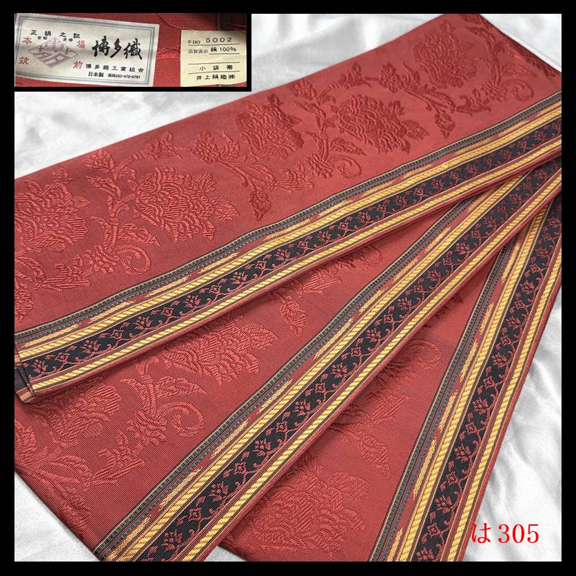 【は305】厳選美品 半幅帯 井上絹織 本場筑前博多織 小袋帯浴衣帯 牡丹唐草紋 茜色地 正絹◇検◇着物簪袋帯名古屋帯和装小物帯締め