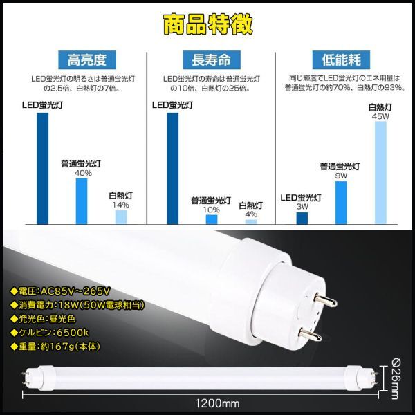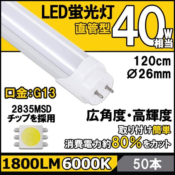 ★送料無料・30日間保証付き★LED蛍光灯 50本セット 40W形相当 T8 直管 120cm 昼光色6000K 高光度 2500LM G13口金 消費電力18W