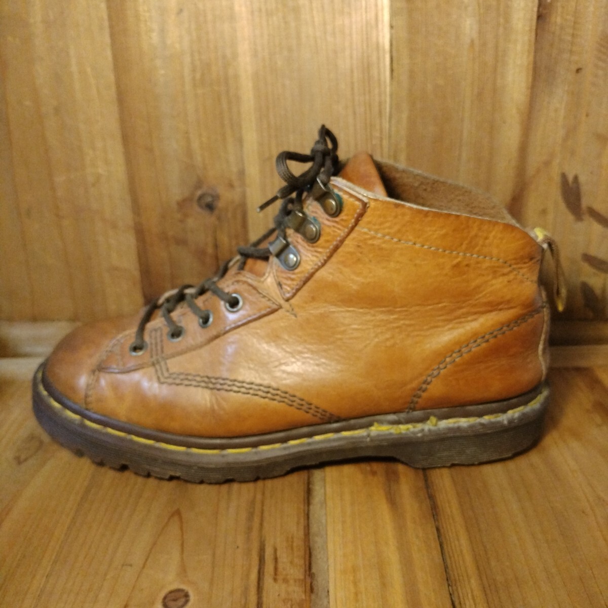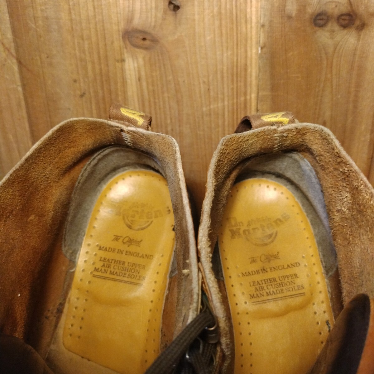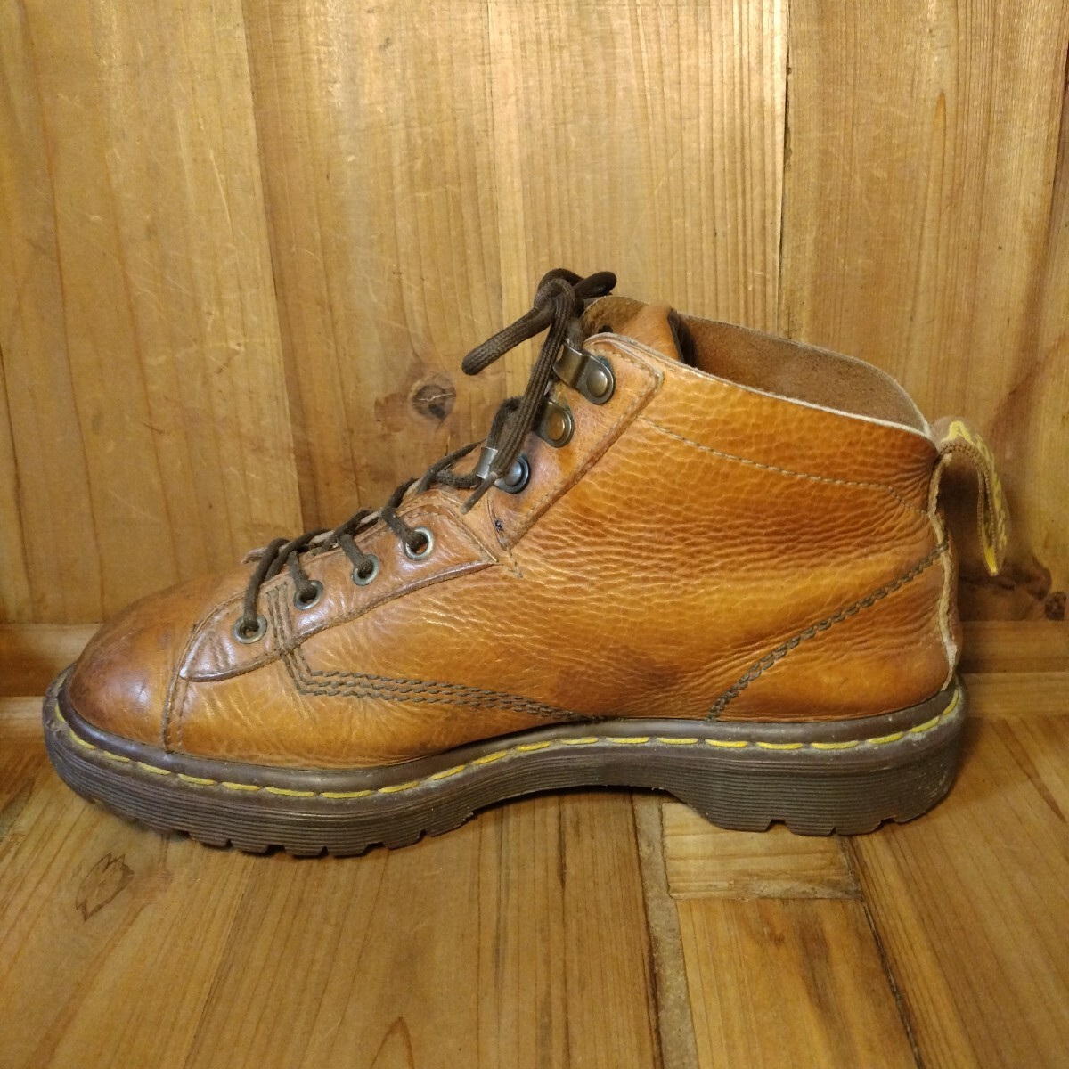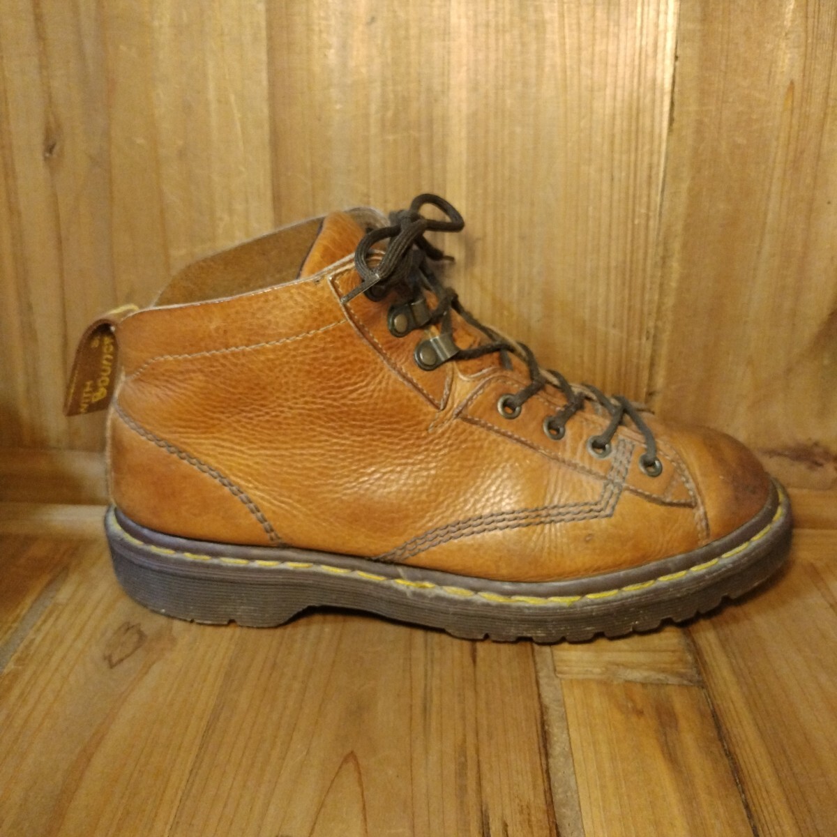 ブラウン系レザーアッパーに4ホール、スピードシューアップ3ホールで脱ぎ履きしやすい特別仕様です。イエローステッチ、サイド刻印無し、AirWairタグ、高密度エアソールと素晴らしいディテールの一足です。