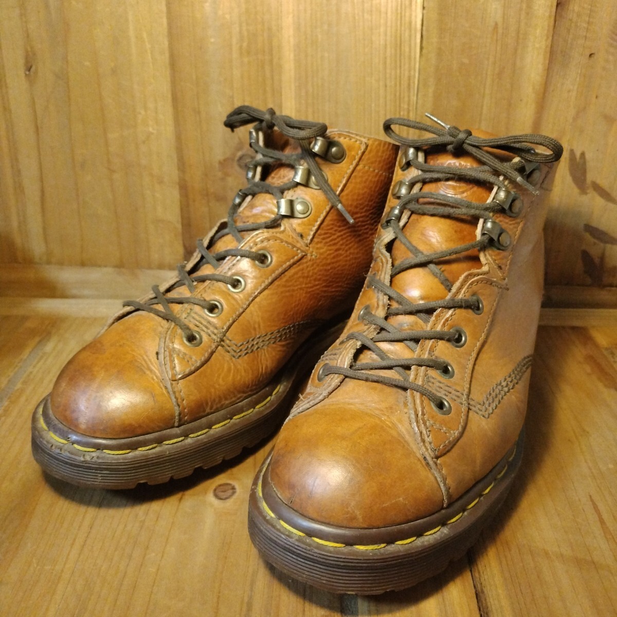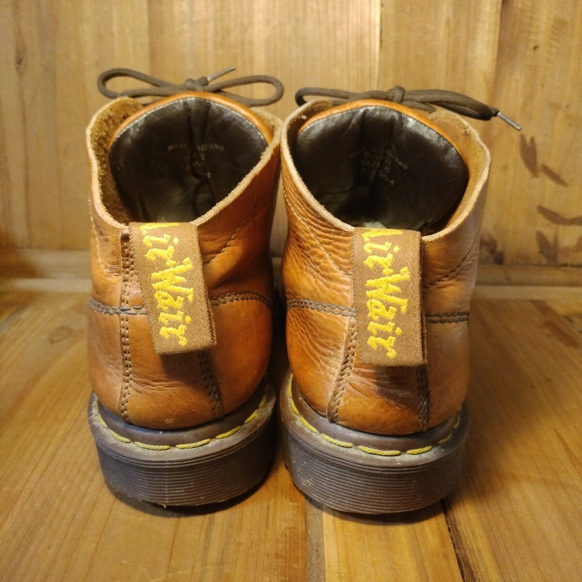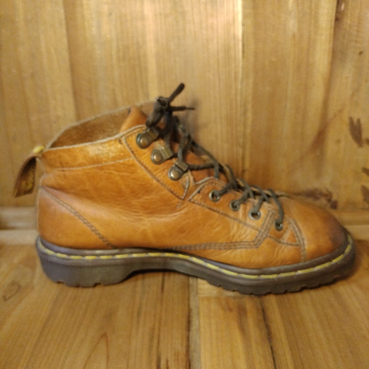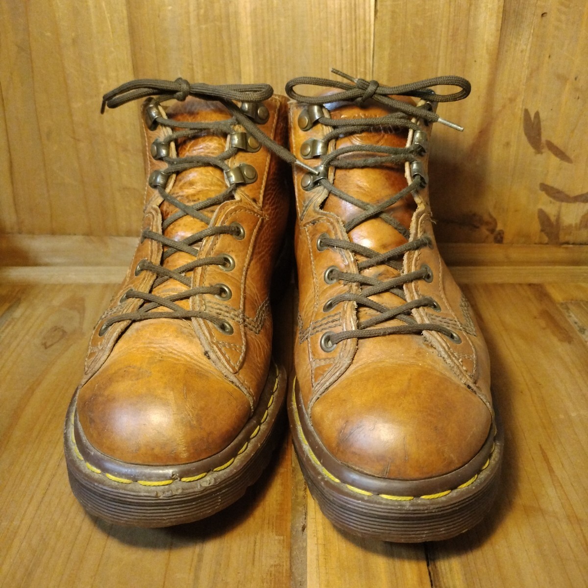 ブラウン系レザーアッパーに4ホール、スピードシューアップ3ホールで脱ぎ履きしやすい特別仕様です。イエローステッチ、サイド刻印無し、AirWairタグ、高密度エアソールと素晴らしいディテールの一足です。