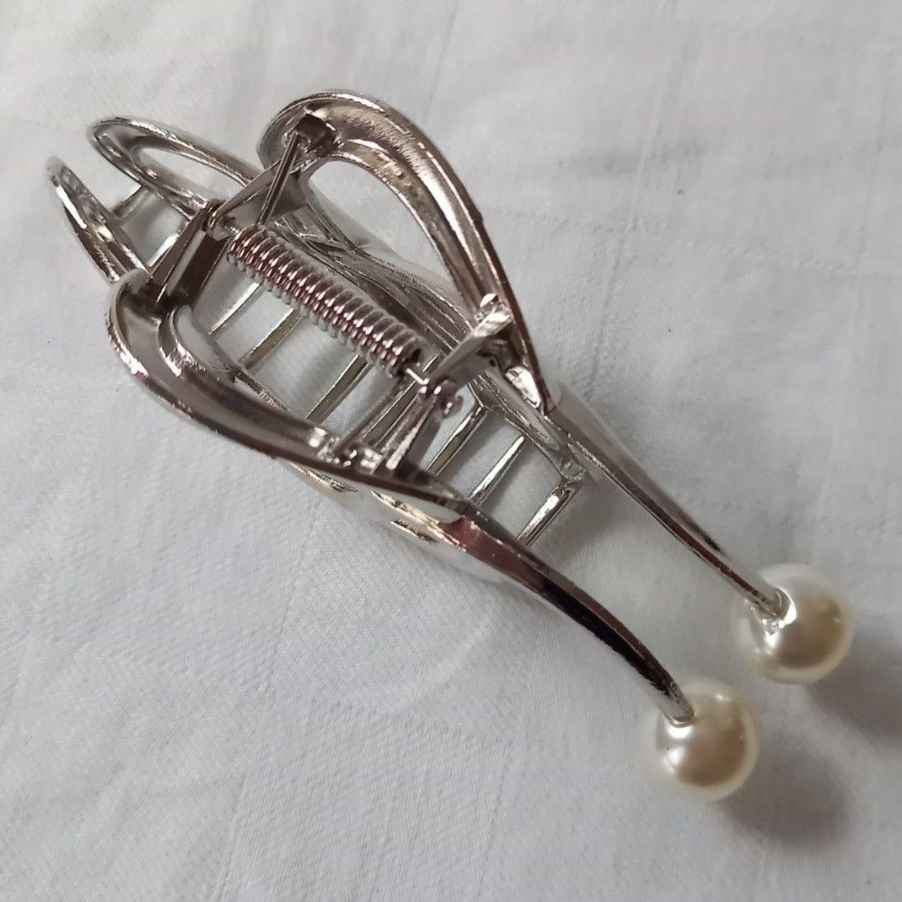 フェイクパールのアクセントが上品さを引き立て、髪につけるだけでエレガントな印象に。