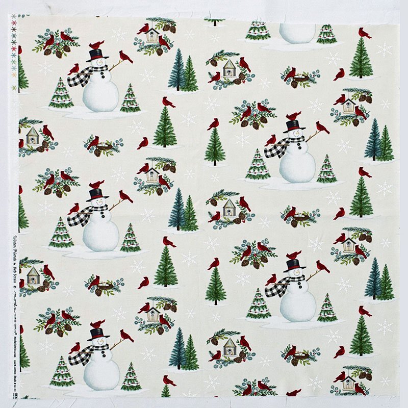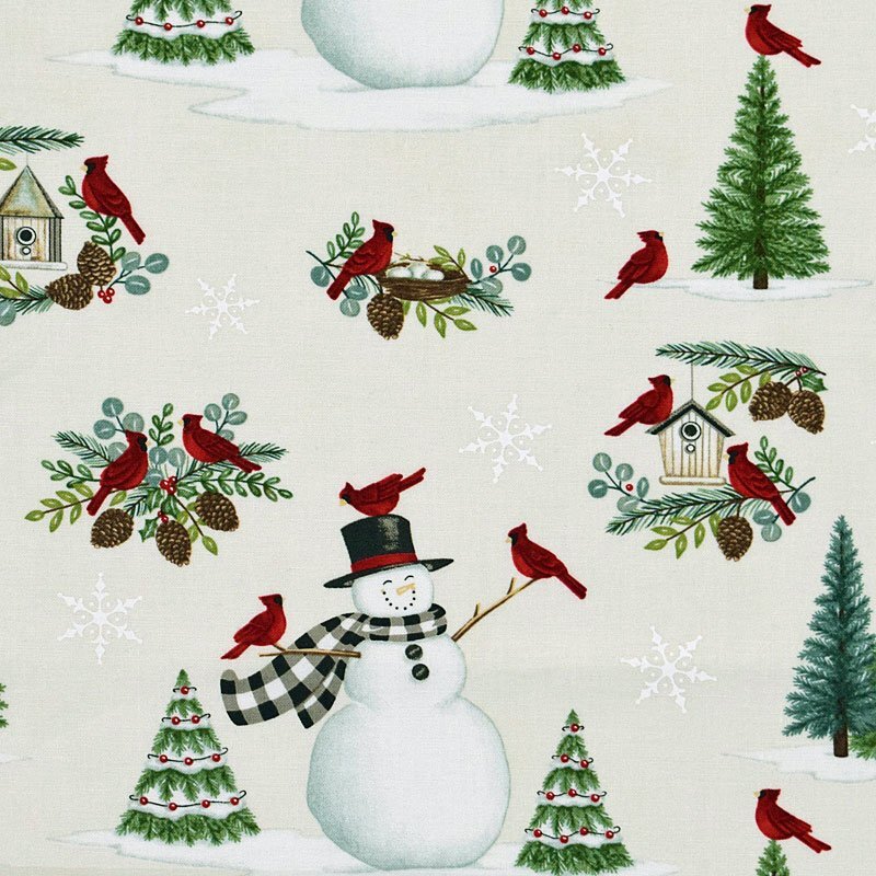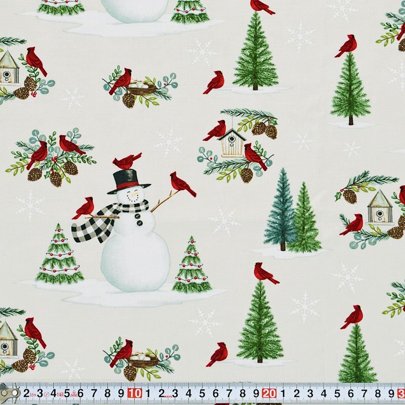 スノーマンとカージナル(赤い鳥)をモチーフにした、クリスマス・シーズンの定番コットンプリント生地です。 【FairyCotton 】