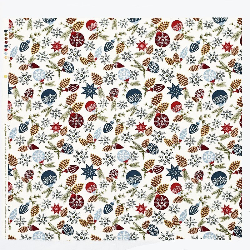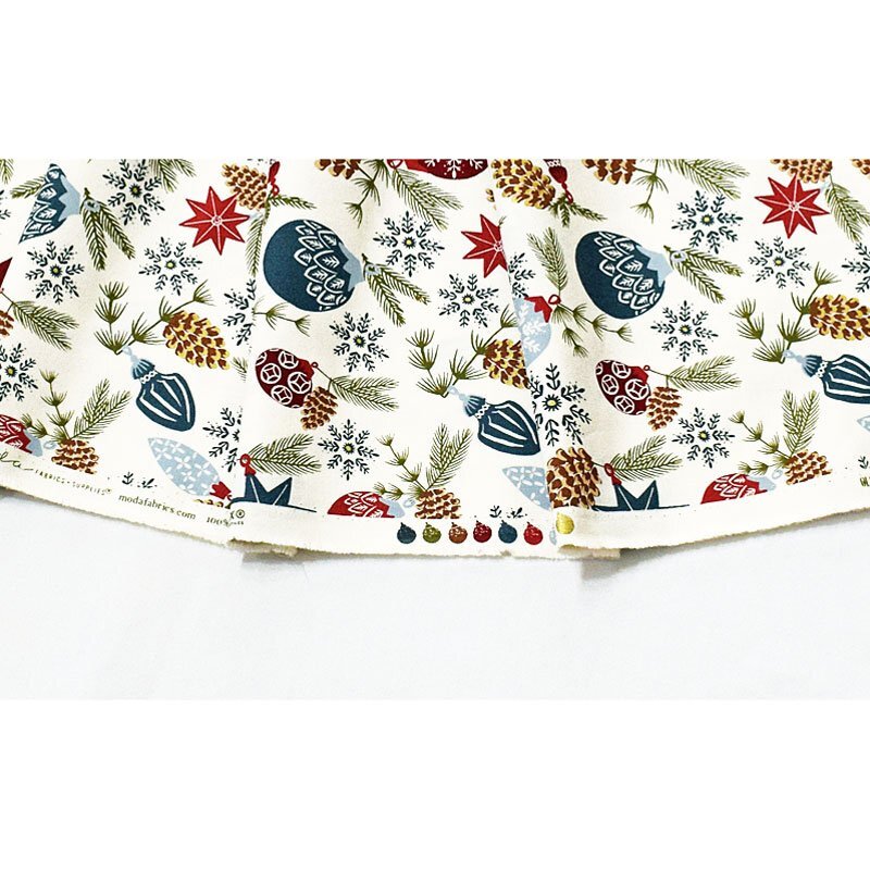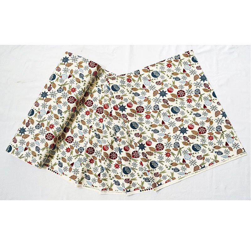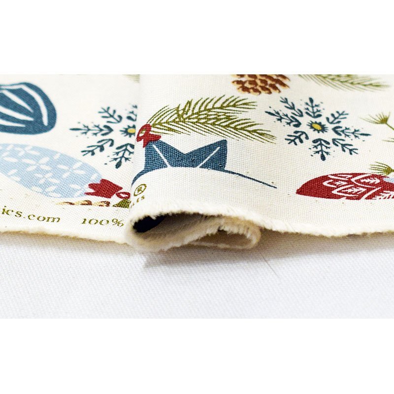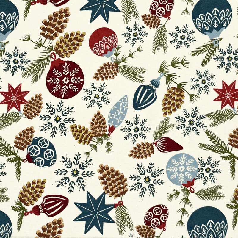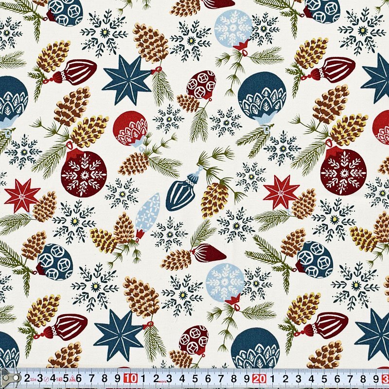 クラシックなクリスマスオーナメント、繊細な雪の結晶、そして松ぼっくりが散りばめられた、落ち着いた雰囲気のトス柄コットンプリントです。 【FairyCotton 】