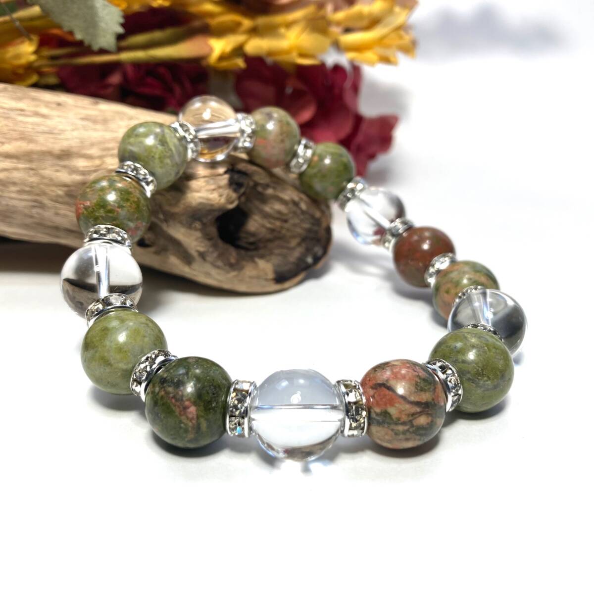こちらは、ユナカイトと水晶を組み合わせたパワーストーンブレスレットです。間にはロンデルを挟み高級感あるデザインに仕上げております。石大きさは12mm玉を使用して内径約18cmです。気になる方は是非この機会にどうぞ。