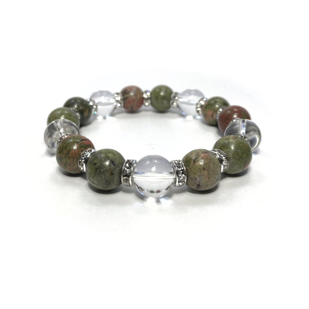 ユナカイト&水晶 パワーストーン ブレスレット 天然石ブレス (シルバー) 12mm 幸運 開運 メンズ 男性♪
