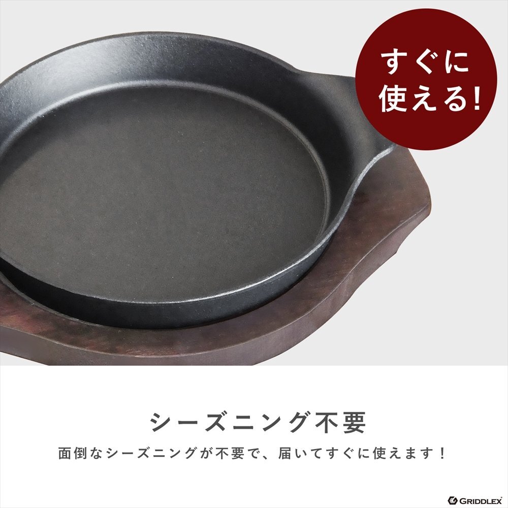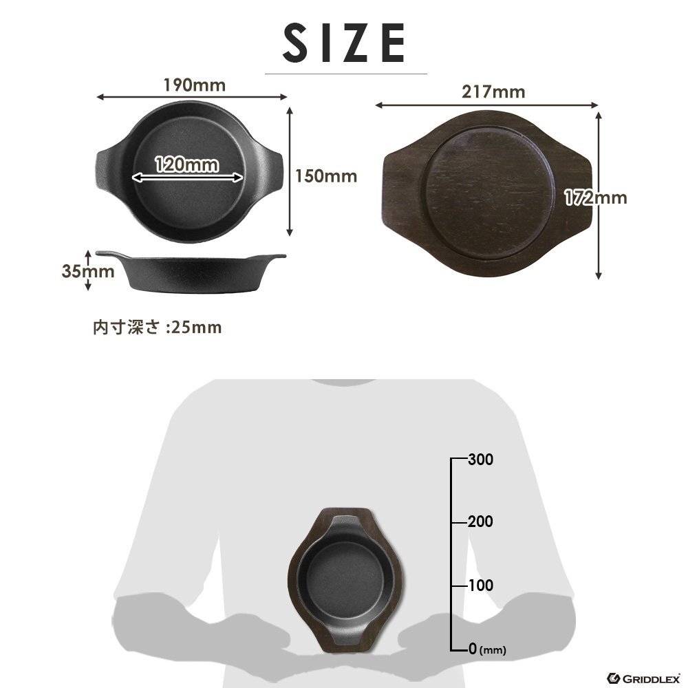 | 鉄板サイズ | 外寸:190mm×150mm×高さ35mm (内寸φ120mm×深さ25mm) 底面(約)(約)φ130mm |
