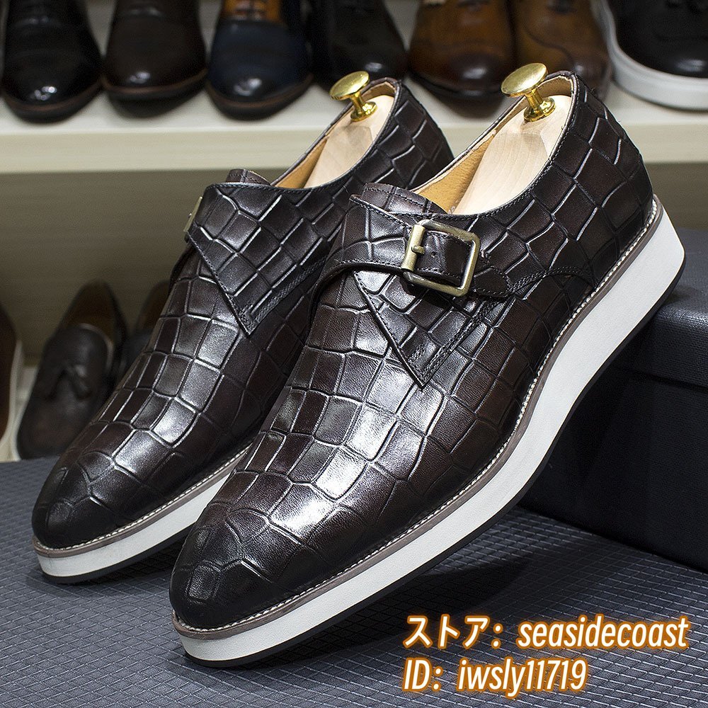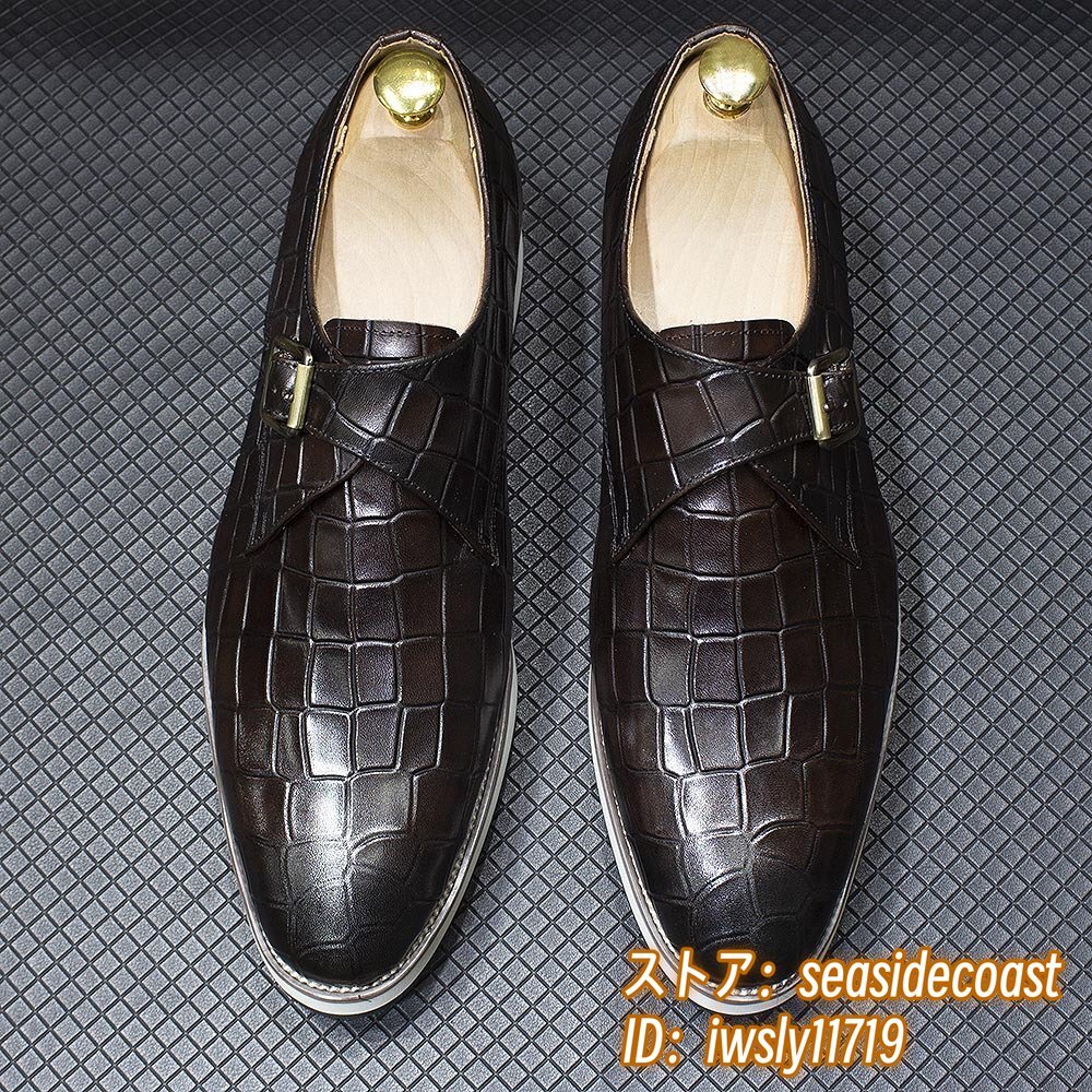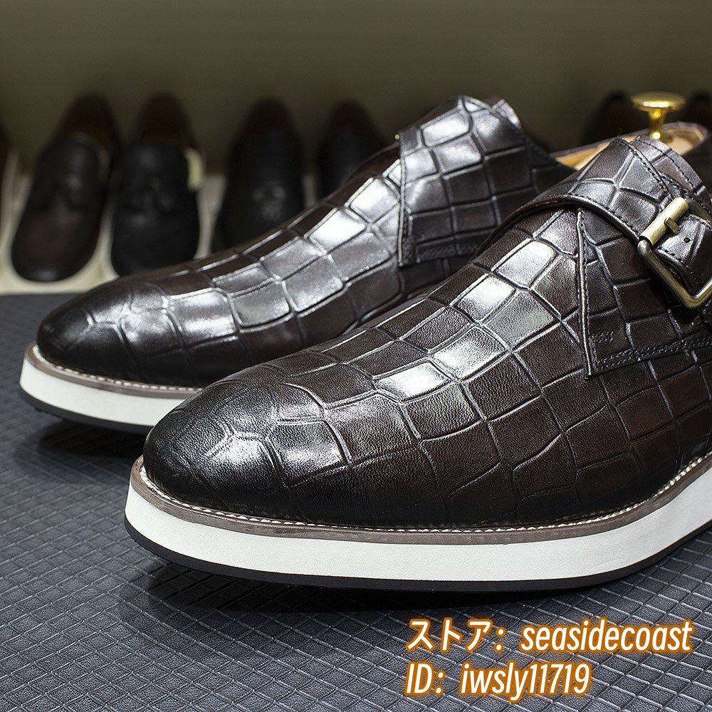 定価11万超◆鰐柄 ビジネスシューズ メンズ 超希少 職人手作り 本革 レザーシューズ 厚底 スリッポン ローファー 高級牛革 珈琲色 27.0cm