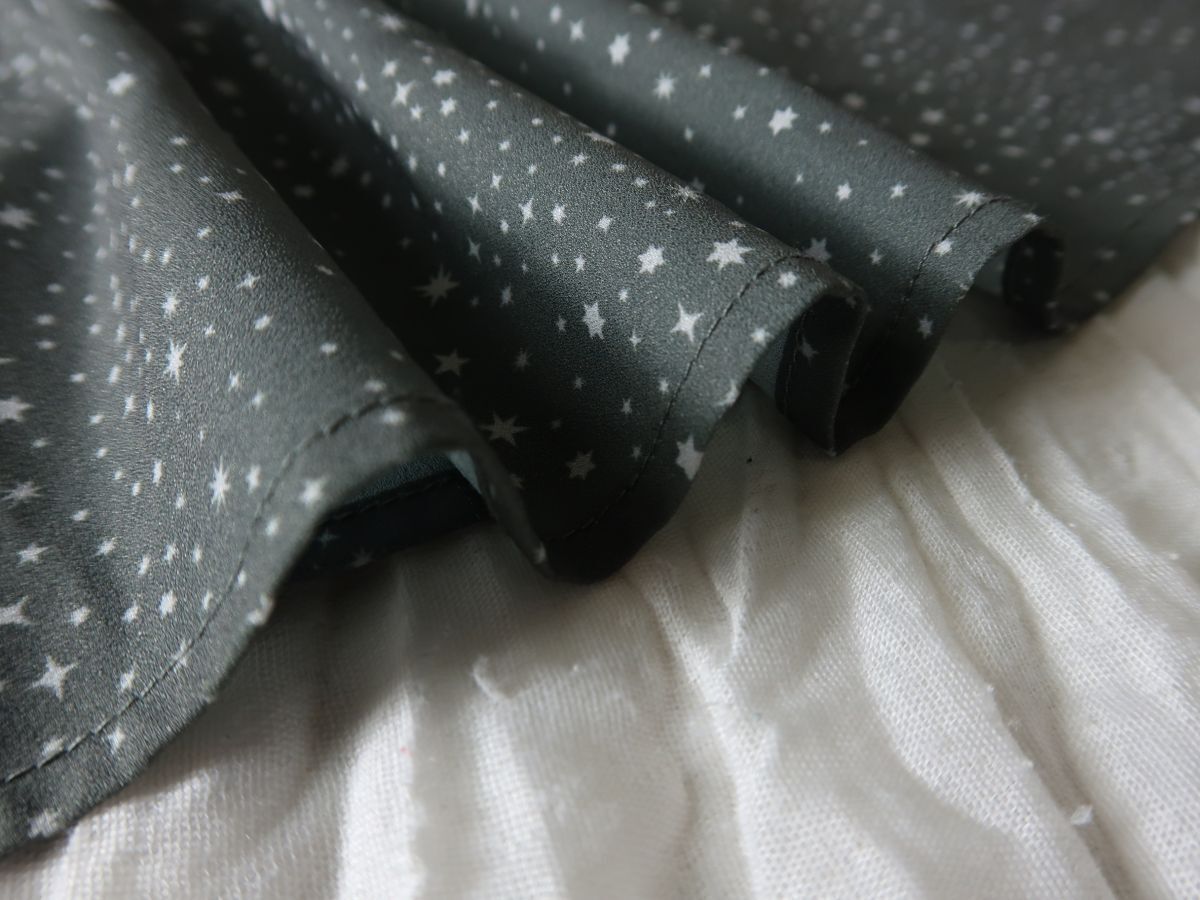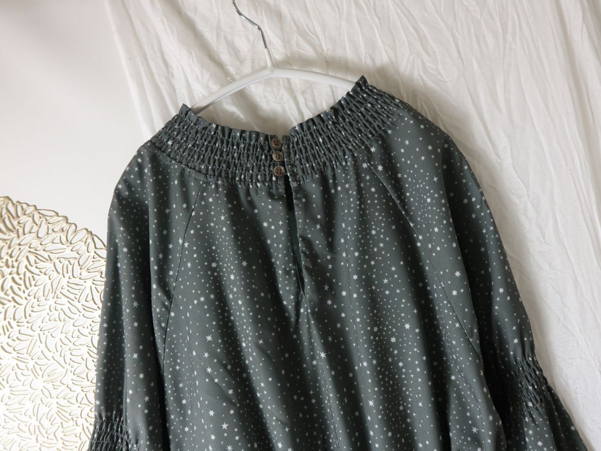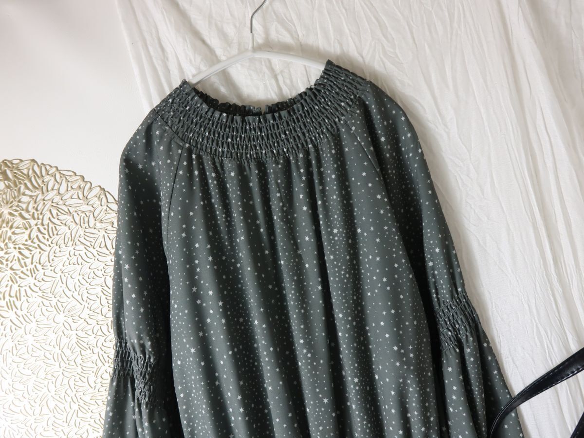 首回り、スリーブ部分、ウエスト部分シャーリングゴム入り。