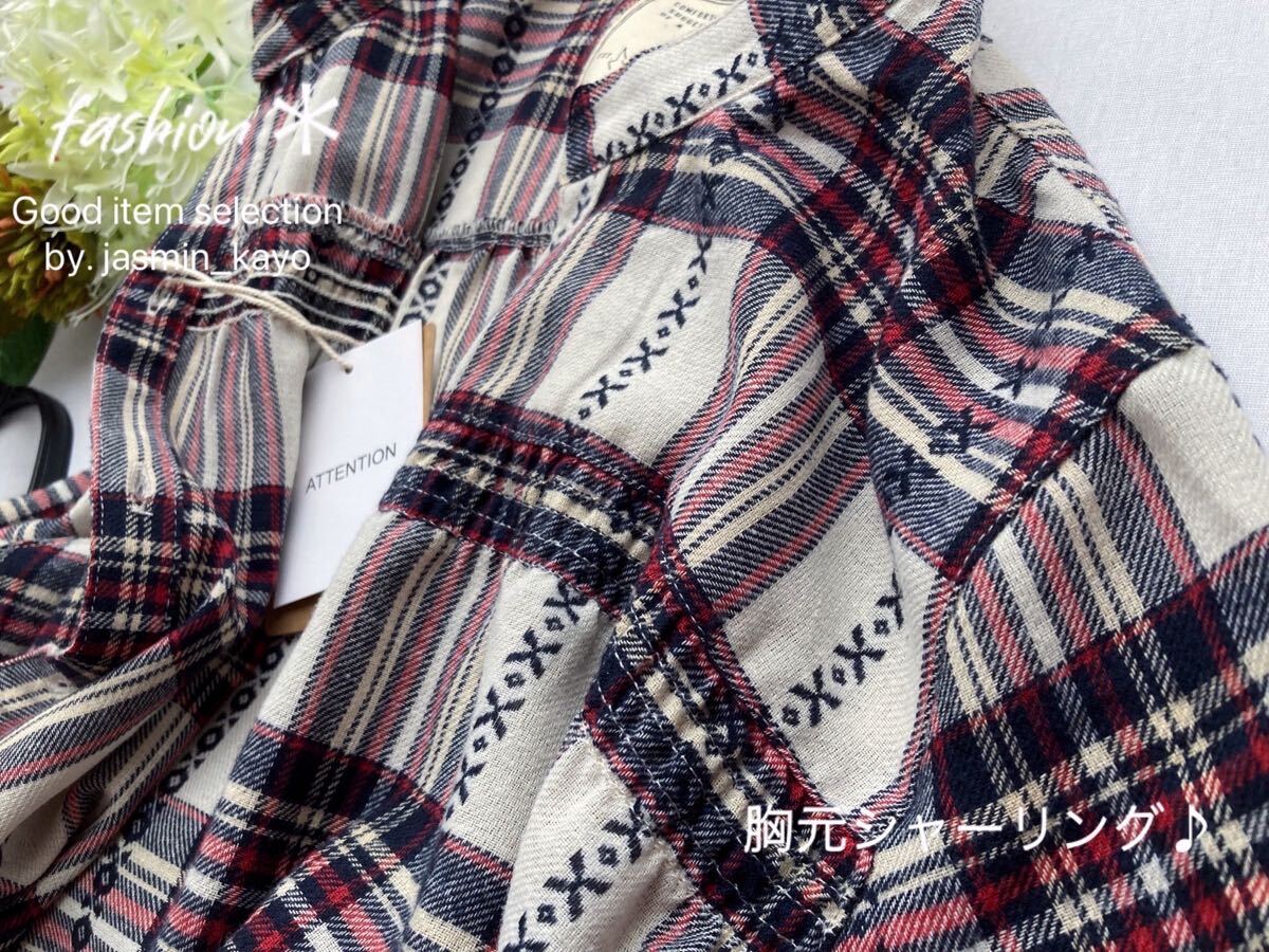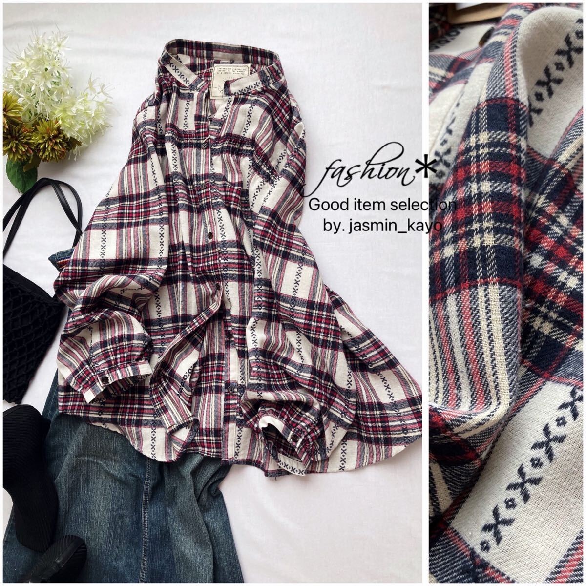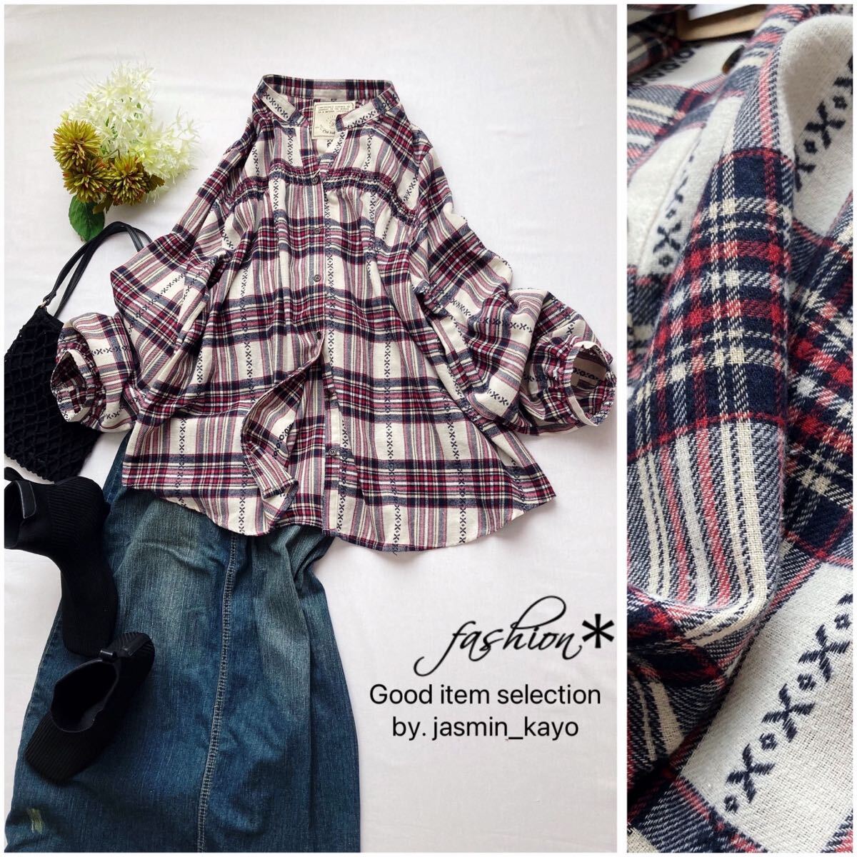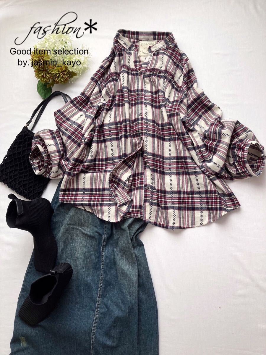 ◆新品4L~3L/LL◆刺繍入りほんのり起毛*赤×濃紺×ベージュ×オフホワイトチェック柄スキッパーネック&シャーリングブラウス羽織りにも