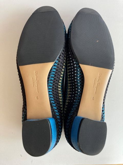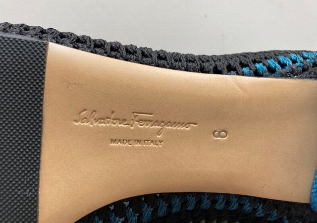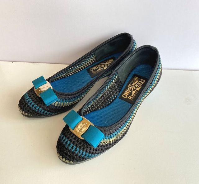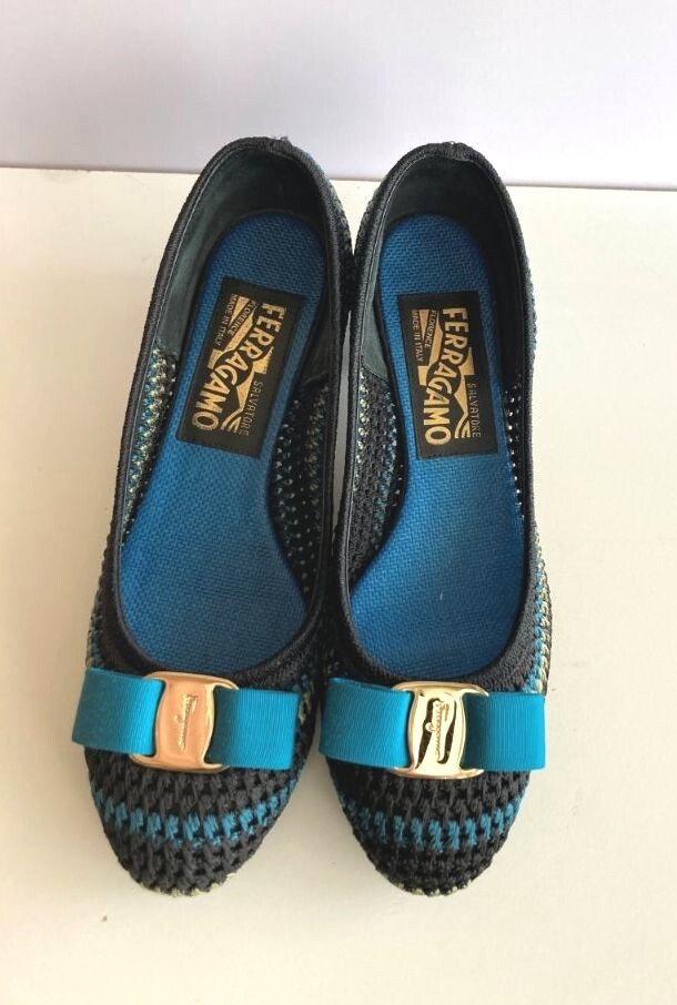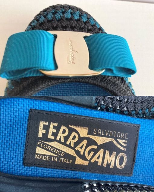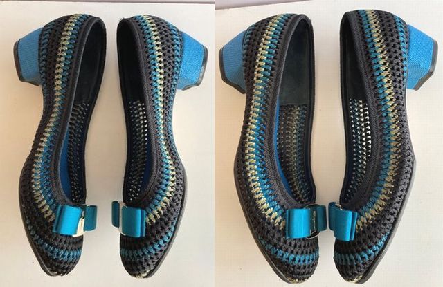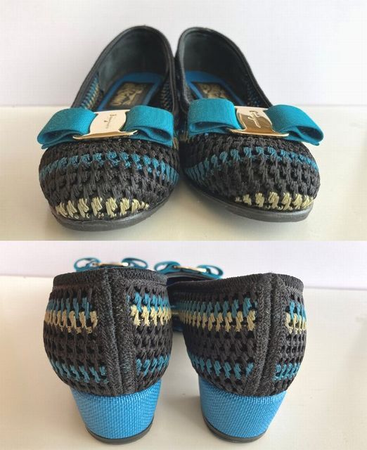 Salvatore Ferragamoのブルーを基調にして、黒とカーキのファブリックで編み上げたロウヒールパンプスです。