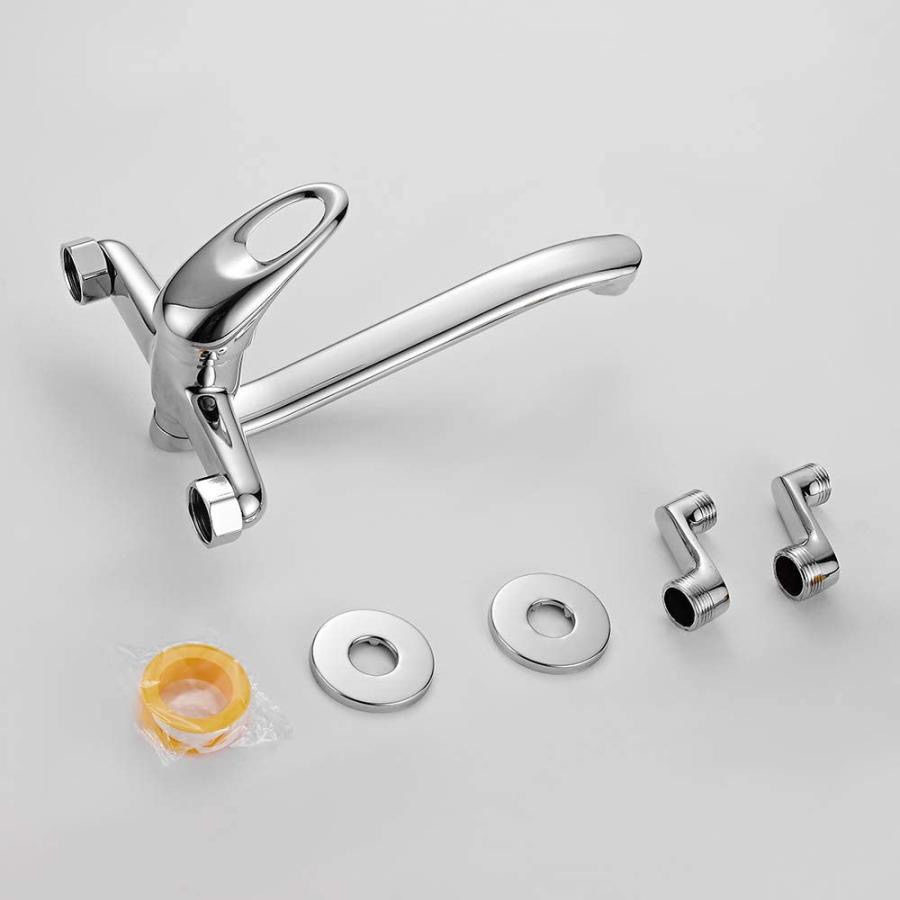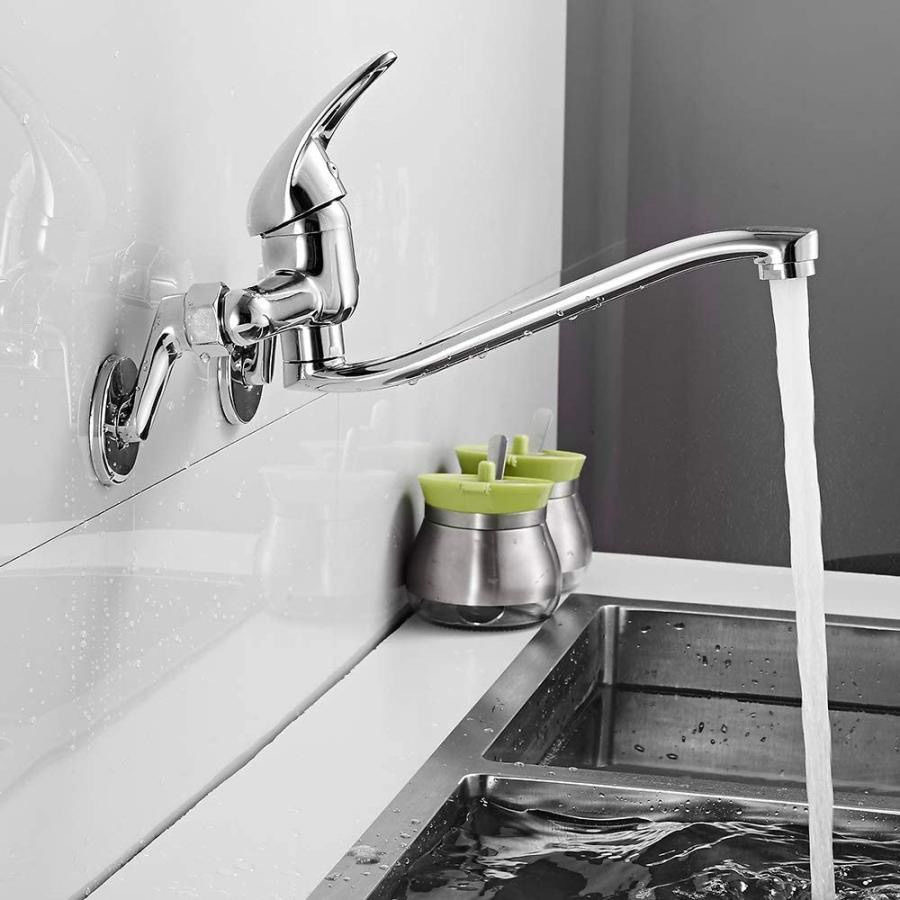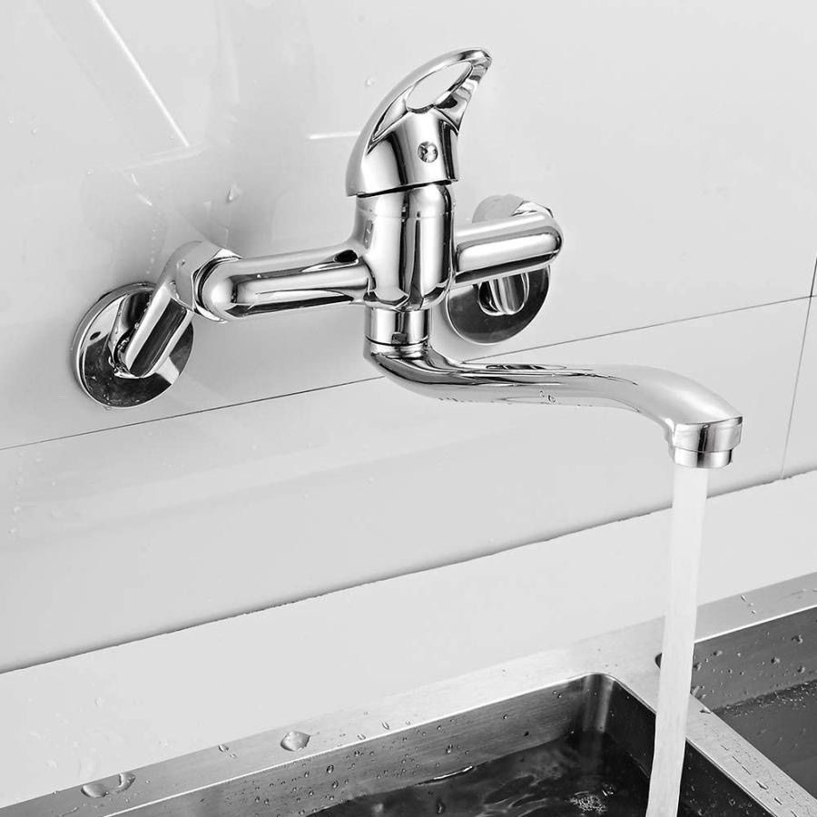 【特徴】壁付き キッチン用シングルレバー混合栓 クロームメッキ&真鍮 吐水口は180°に回転可能。