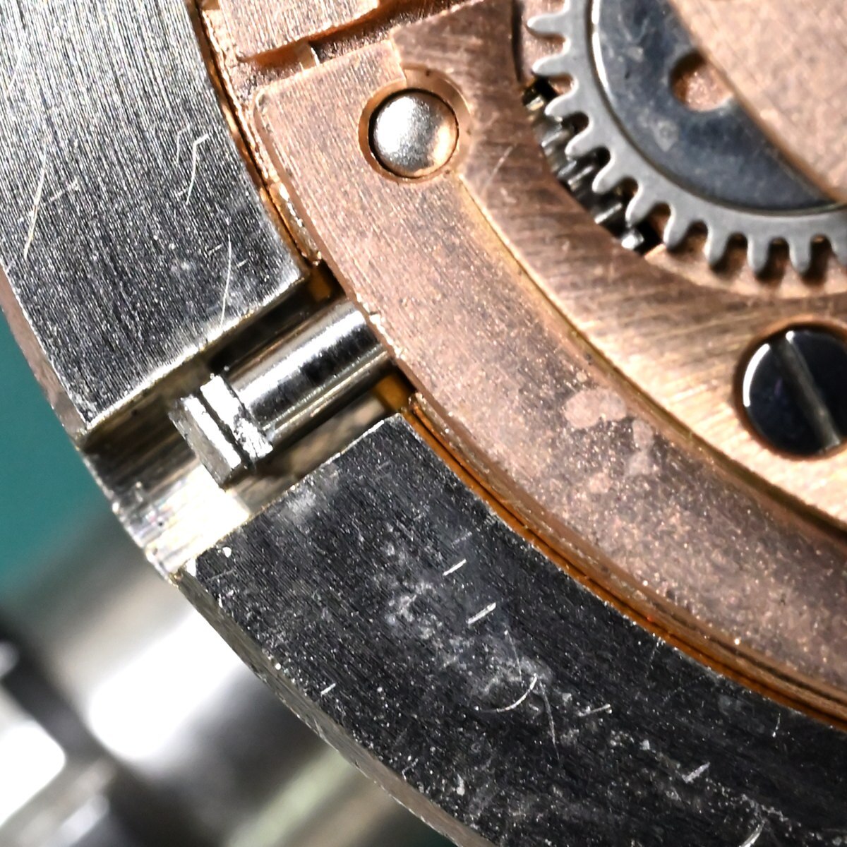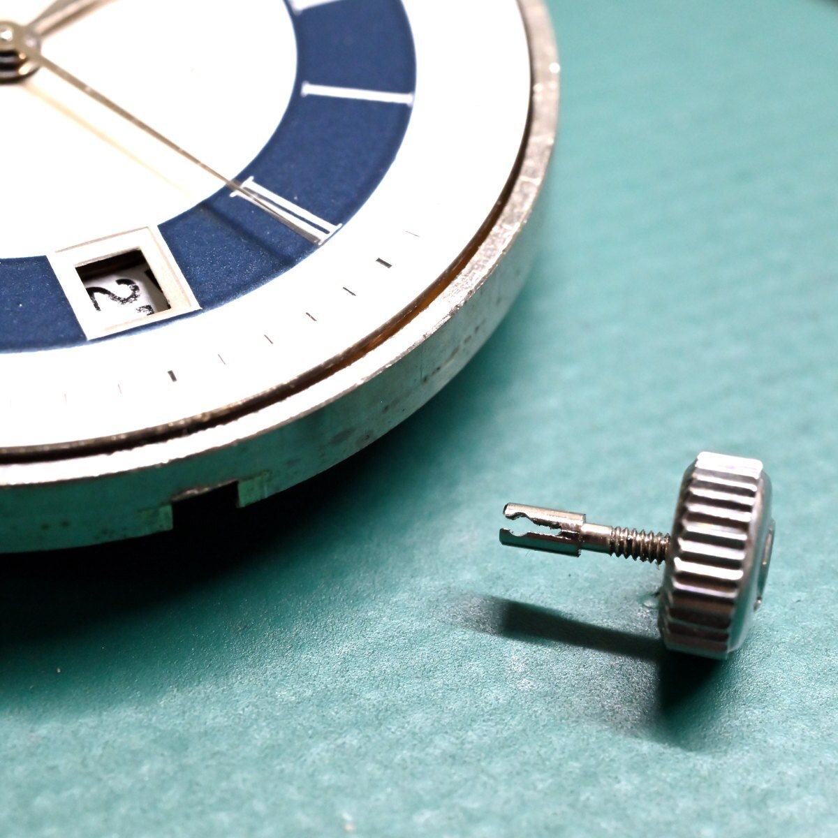 * リューズはオリジナルの部品が入手できなかったため、職人に依頼しジョイント式リューズが製作取りつけしました。