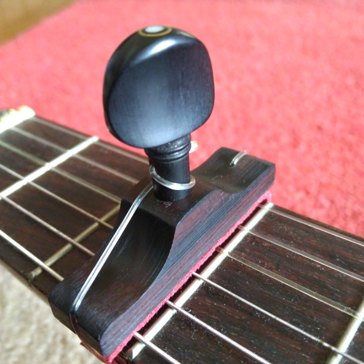 装着時にただペグを 締め上げるのではなく できるだけ フレットに 近づけ 左手で 指板にカポを ぎゅっと 押し付けておいて その状態で ペグを巻いて 締め る のがコツです。