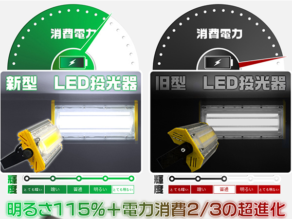 超薄型LED投光器は有名メーカーが製造する高効率で省エネ、品質に安心できるLEDチップを採用しております。エネルギー消耗を30%削減した同時に、照射強度を旧型の115%までUPさせることに大成功!