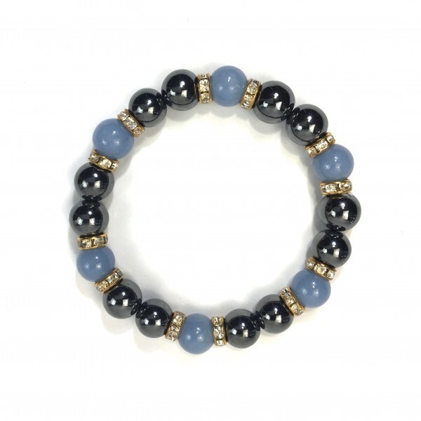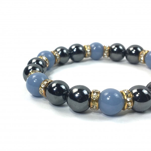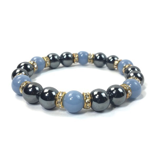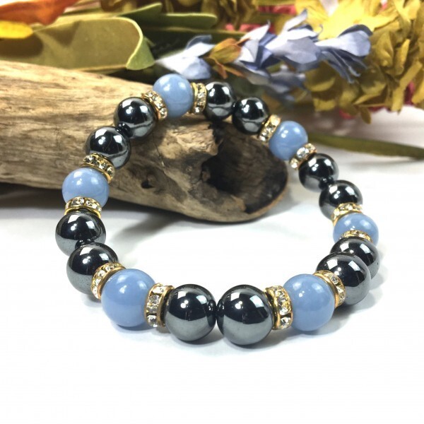 こちらは、ヘマタイトとエンジェライトを組み合わせたブレスレットです。間にはロンデルを挟み高級感あるデザインに仕上がっています。石大きさは腕にも馴染みやすいように10mm玉で内径約17cm(伸可能)です。数に限りがございますので気になる方はお早めにどうぞ。サイズ調節も可能ですのでサイズ調節の場合は取引ナビにてご一報くださいませ。(サイズ調節無料です)