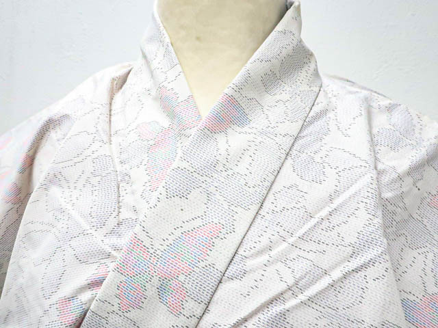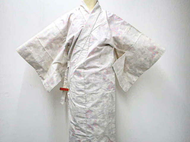 リサイクル商品のため、衿と表所々しみがございますが着用可能なお品です。 肩当付でございます。 地色は灰紫です。 1枚目の画像が近いお色かと思われます。 素材は正絹です。 |