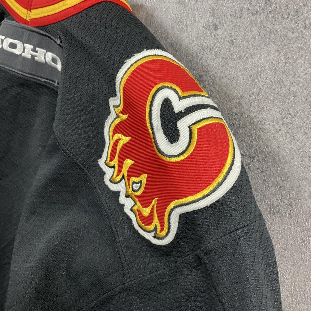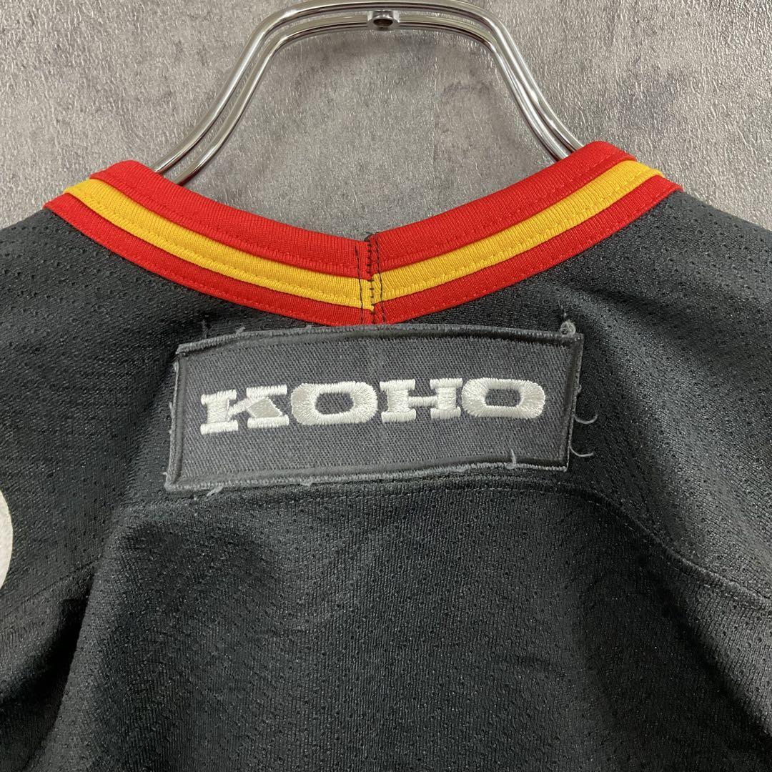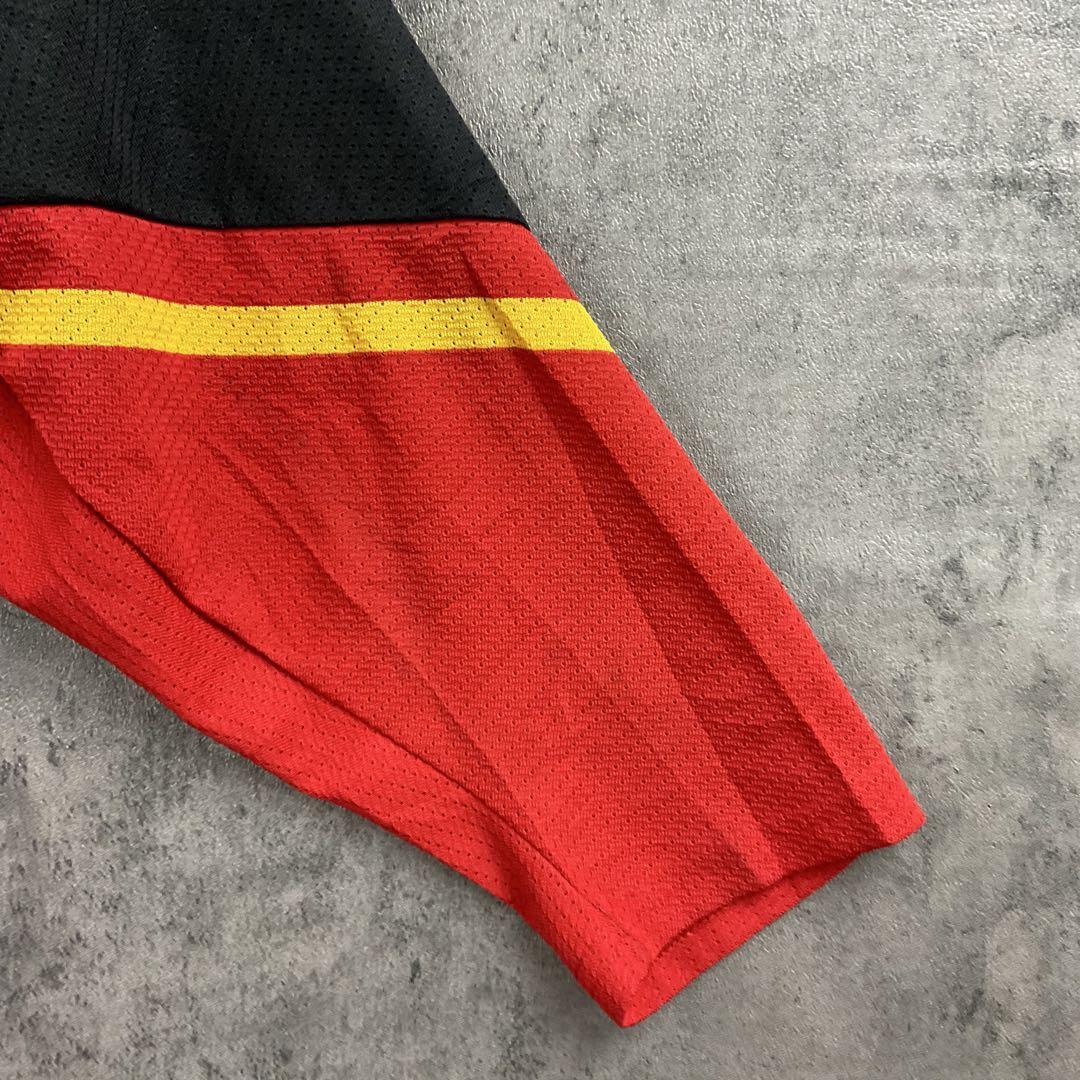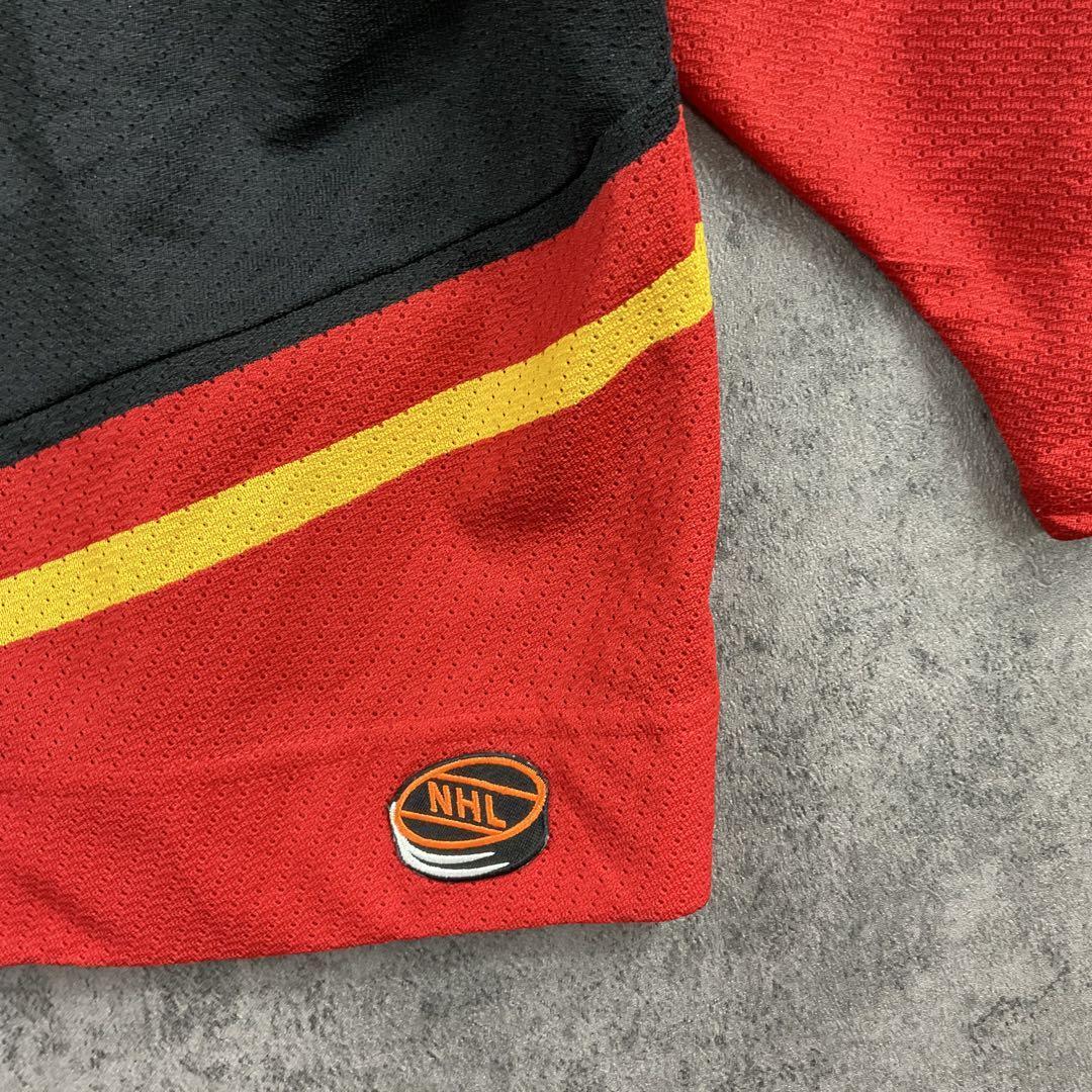 NHL公式サプライヤーKOHO製、カルガリーフレームスのアイスホッケージャージ。ブラックを基調にレッドとイエローのチームカラーが映える一着で、フロントにはオルタネートロゴ、袖にはフレイムスのクラシックロゴ入り。コレクションやスポーツ観戦、ストリートコーデにも最適な存在感あるアイテムです。